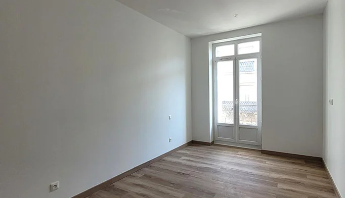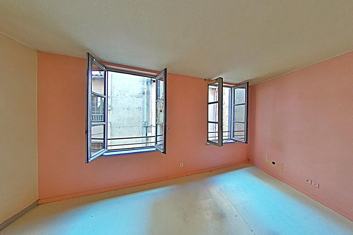 Deuxième étage sans ascenseur, on entre sur une grande pièce à vivre, une chambre (non fermée) sur l'arrière, espace cuisine ouverte, salle de bains avec toilettes.