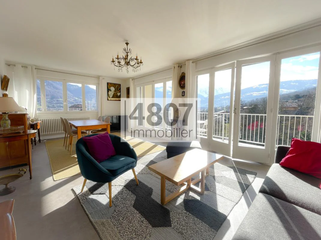 Ce logement baigné de lumière se compose d'une entrée avec placards, un magnifique séjour de 28m2 donnant accès à une belle terrasse plein Sud avec vue imprenable sur le Mont-Blanc, une cuisine séparée Schmidt (pouvant être ouverte), un cellier-buanderie, 3 chambres côté Est, une grande salle d'eau avec séchoir et un wc séparé.