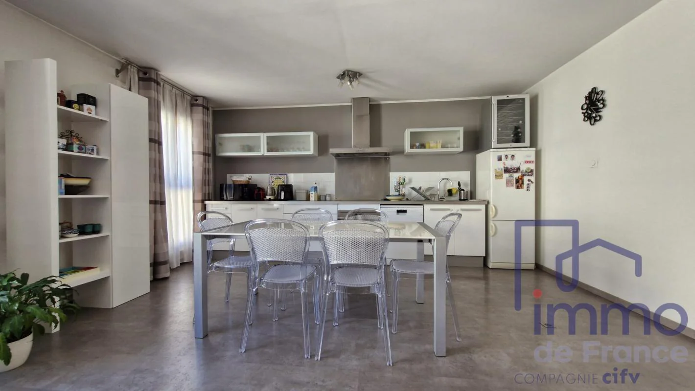 Une pièce de vie généreuse et lumineuse, sublimée par une cuisine ouverte, équipée et meublée -- un espace à la fois convivial et contemporain.