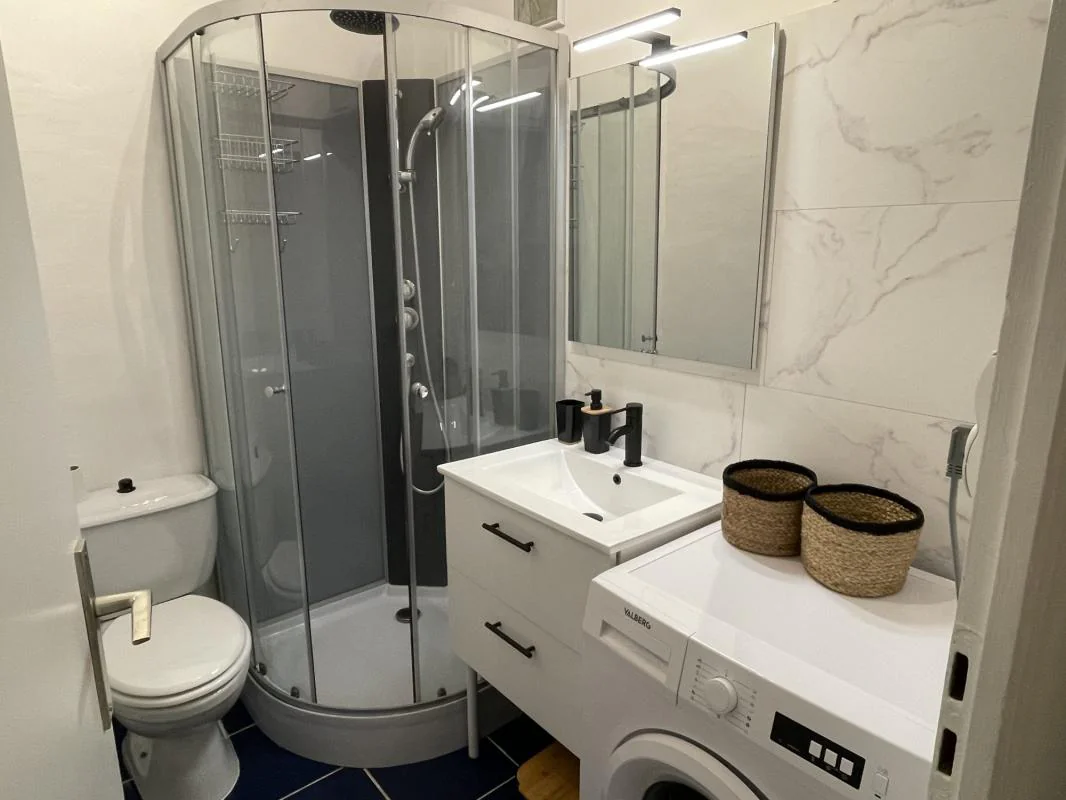 Entrée sur pièce de vie, cuisine séparée aménagée et équipée, chambre avec dressing. Salle de douche avec avec WC, meuble vasque et machine à laver.