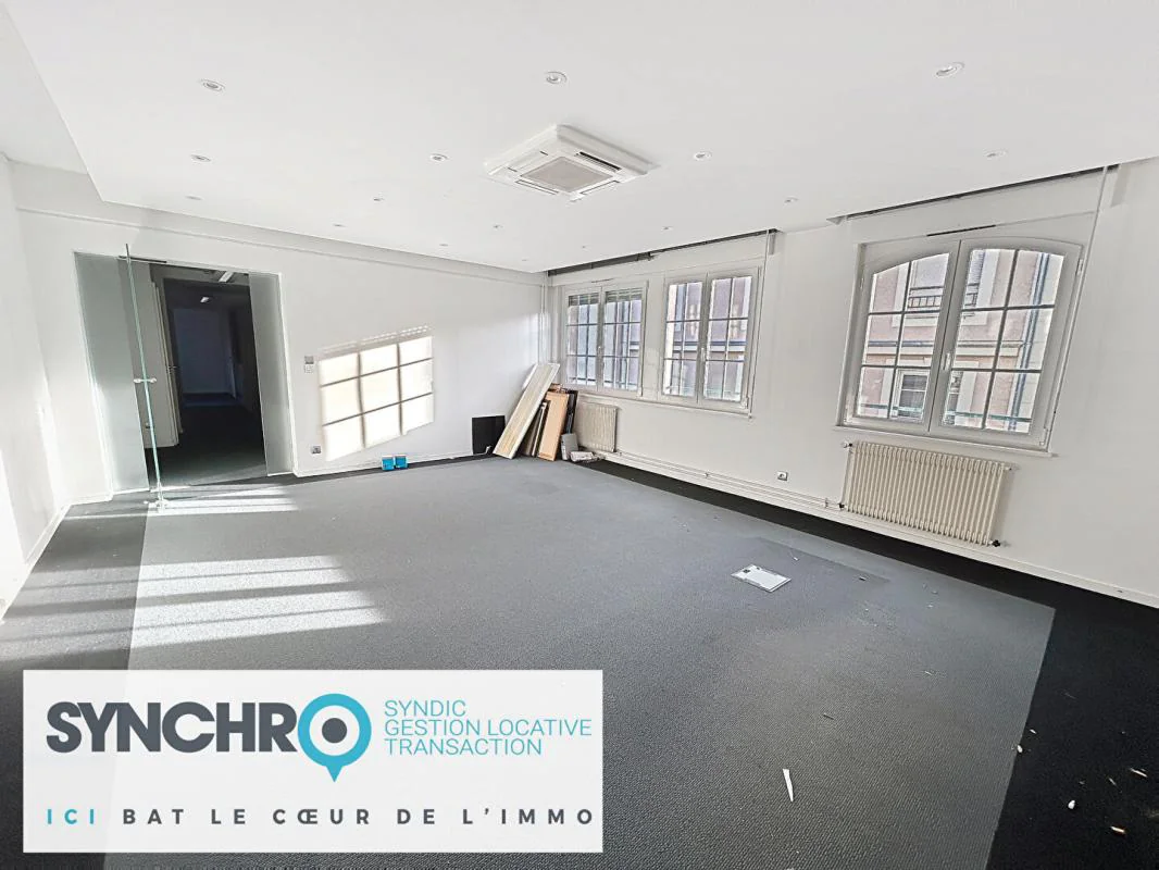 Anciennement bureaux de direction, ce plateau est à réaménager en appartement F4, offrant de nombreuses possibilités d'agencement : vaste séjour, cuisine, trois chambres, bureau, etc.
