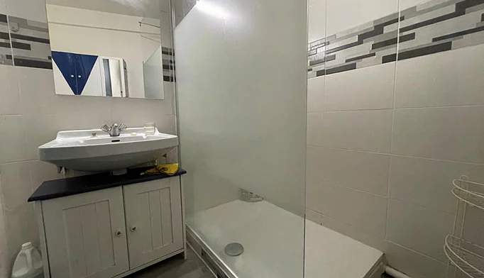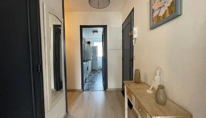 Entrée, Beau séjour exposé Ouest avec cuisine US (Décoration soignée), chambre au calme, Salle de douche, wc. Chauffage Gaz individuel.