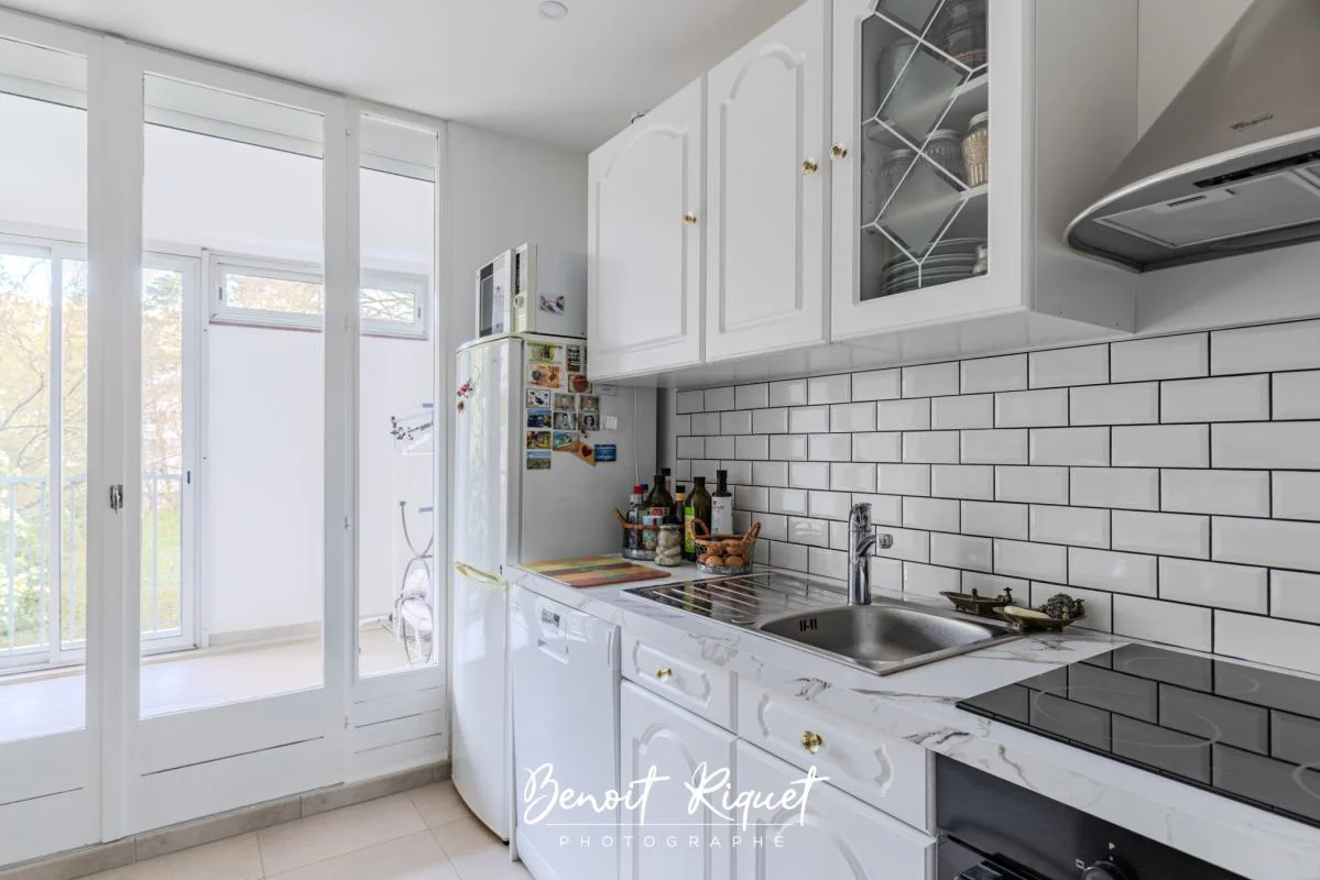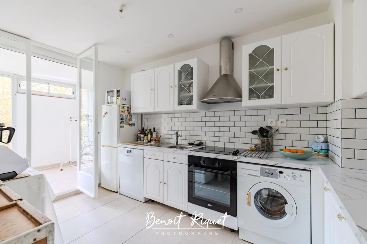 D'une cuisine de 10m2 tout équipée avec accès à la loggia fermée de 6m2 permettant d'agrandir l'espace de vie en toute saison.