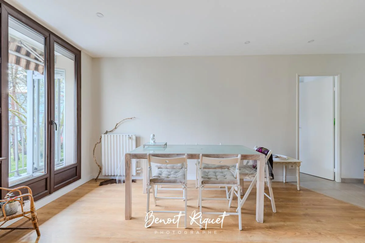 D'un joli séjour salle à manger donnant sur un balcon de 7m2 avec vue sur un petit parc boisé,