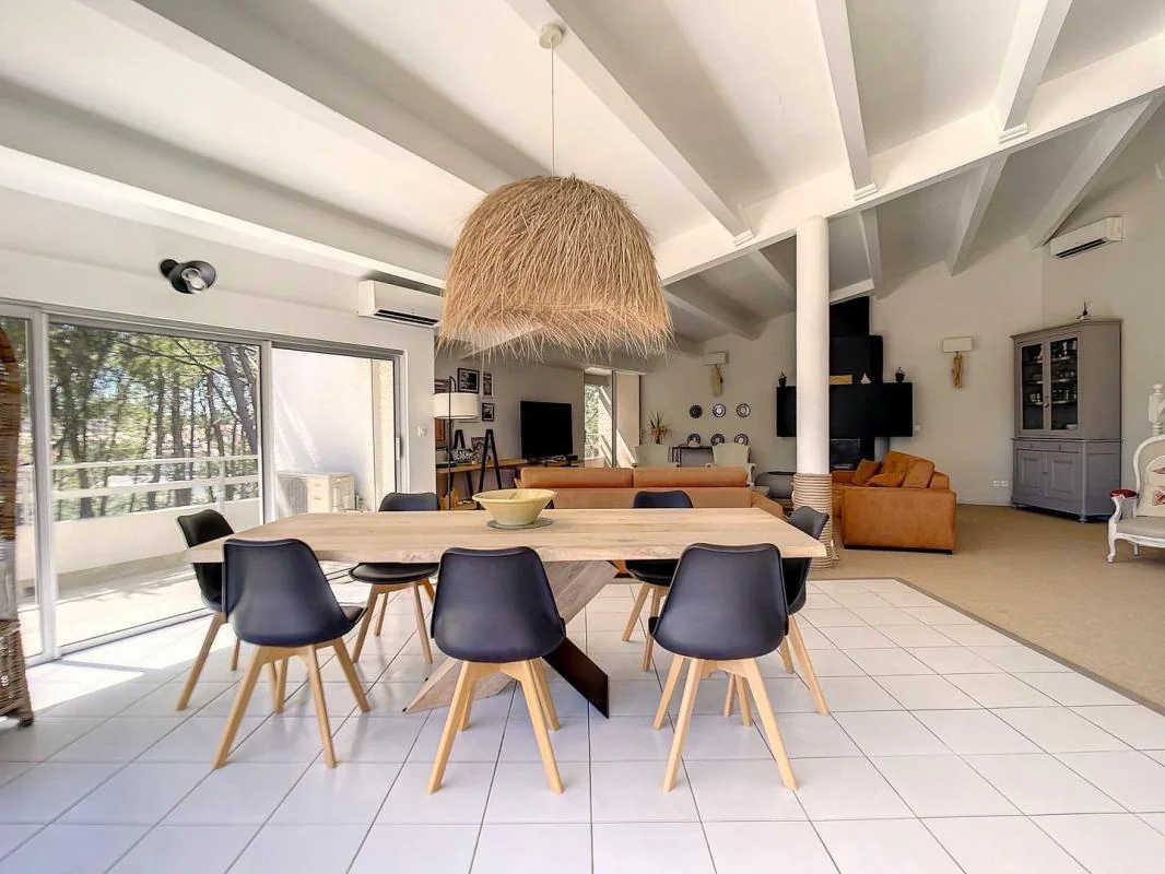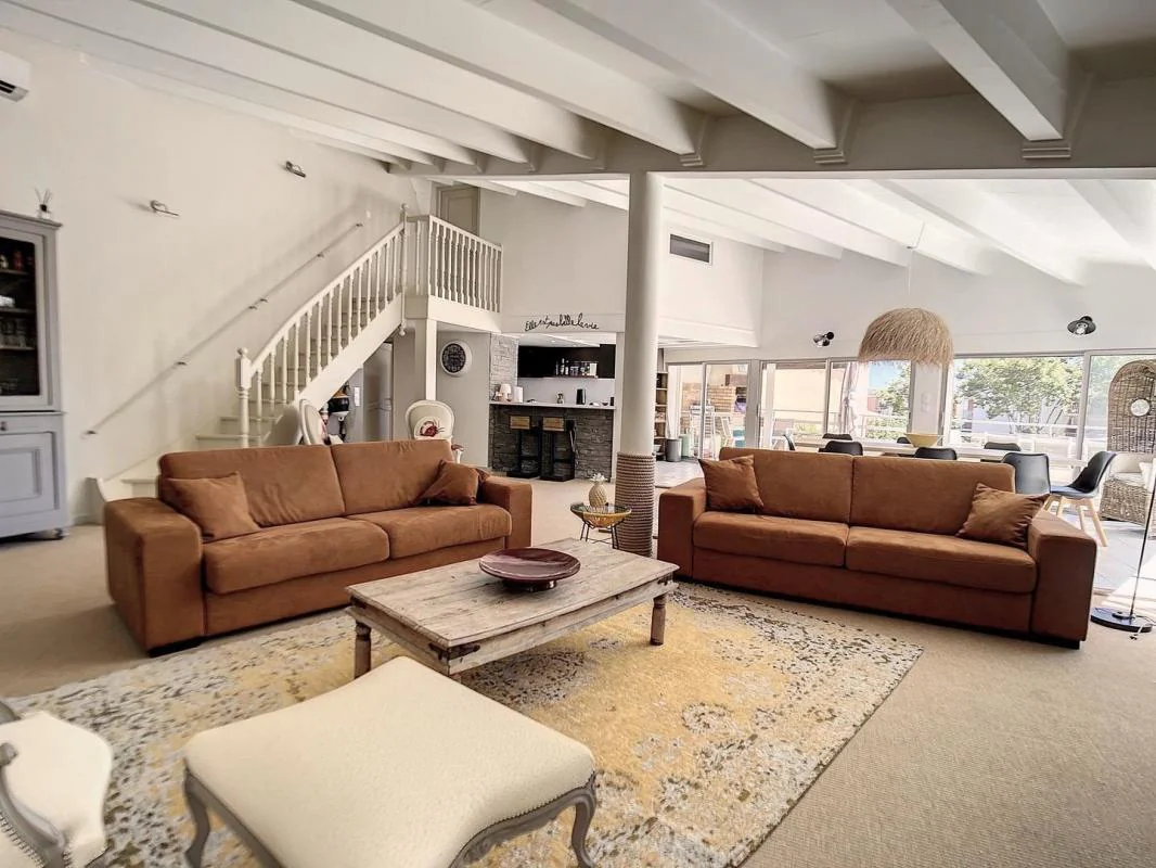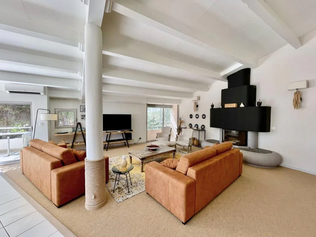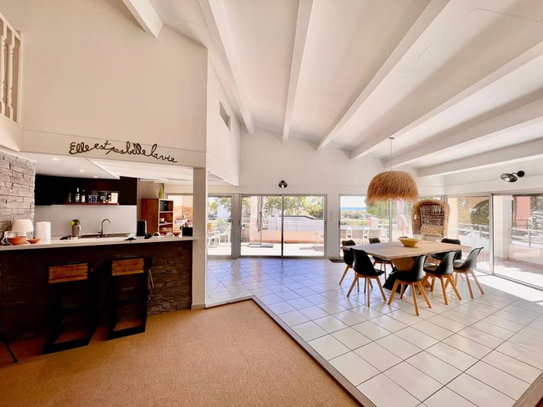 RICHELIEU : VUE MER Bien d'exception ! Splendide appartement PENTHOUSE de 180 m2, 5 pièces, style loft, R+1 , situé au 2ème et dernier étage d'une petite résidence, plein sud, avec vue mer, piscine et parc. Très grands volumes, architecture moderne, 4 chambres avec SDB attenantes, dont 1 grande suite parentale dotée d'une vaste salle de bain ultra contemporaine. Entrée magistrale, immense séjour avec 2 façades en baies vitrées linéaires, cheminée, terrasse d'angle de 40 m2, et garage privé de15m2. Vous serez séduits par la taille exceptionnelle de cet appartement, et sa décoration bord de mer qui vous met immédiatement dans une ambiance de détente et de vacances.