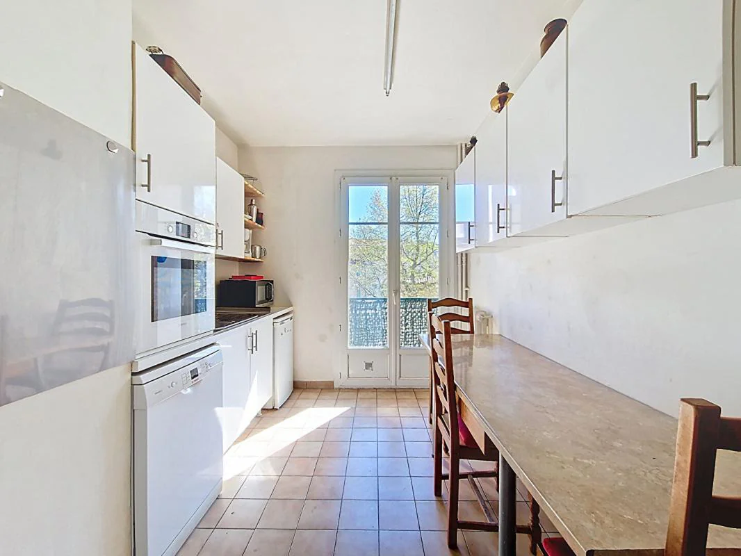 Cet appartement lumineux et traversant se compose d'une entrée avec placard, un salon / salle à manger de 21 m² donnant accès à un balcon, une cuisine séparée avec loggia, un couloir, deux grandes chambres de 14 et 15 m² et une salle d'eau.