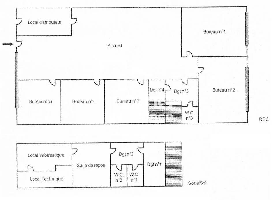 - Rez-de-chaussée : vaste espace d'accueil de 45 m², 5 bureaux, wc et local.