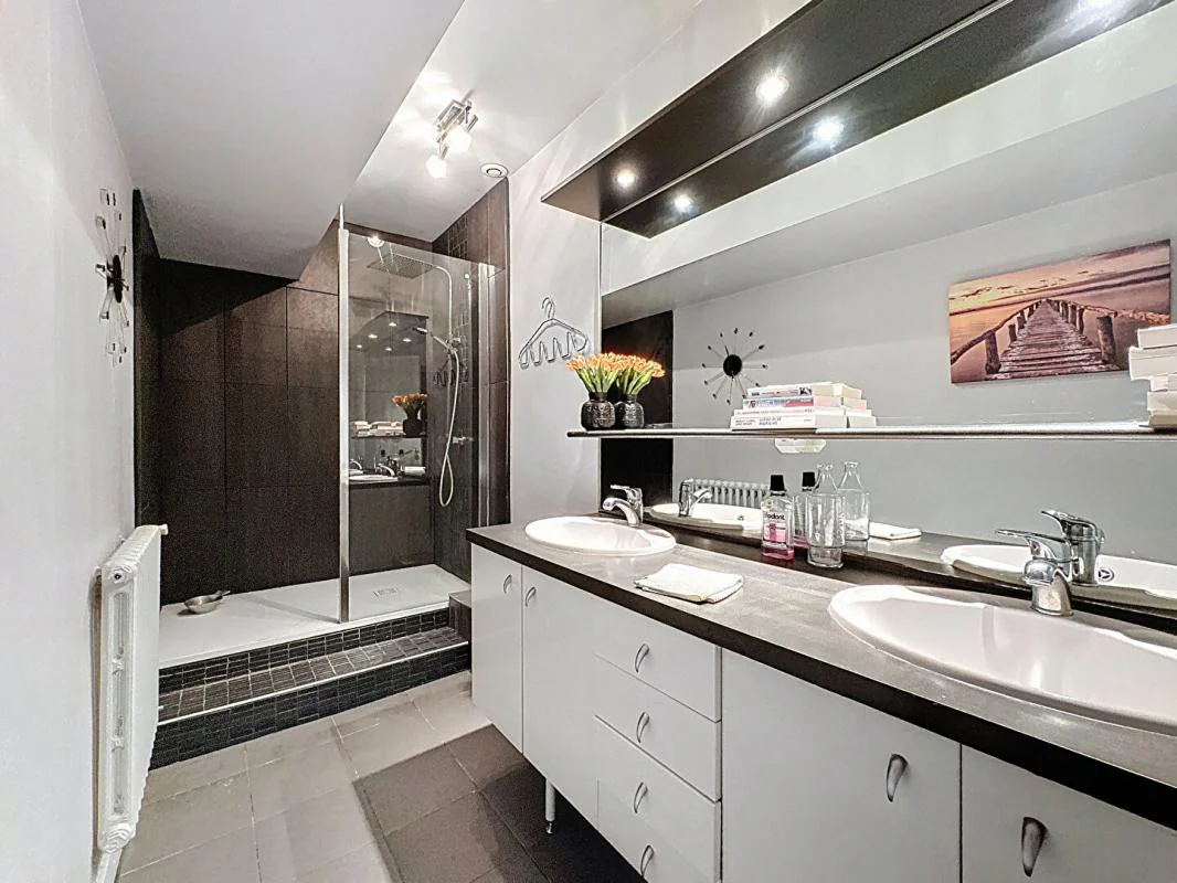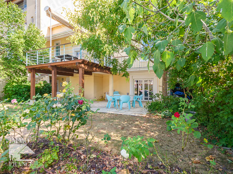 le rdc est équipé d un garage pour 3 voitures avec porte mordorisée indispensable en ville , une buanderie, une cave.. une alarme complète ce bien.
