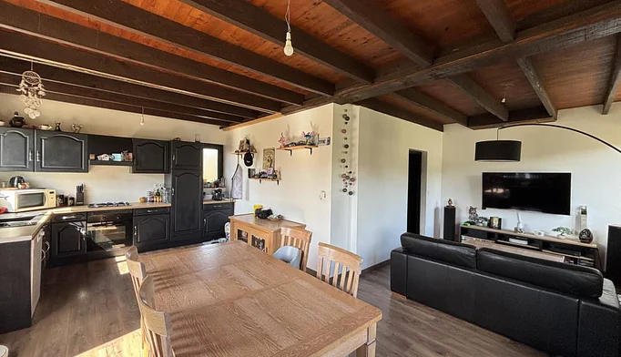 o Une pièce de vie chaleureuse de 22 m², équipée d'une cheminée Godin pour des soirées conviviales donnant directement sur la véranda lumineuse de 23 m², offrant un espace agréable en toute saison.