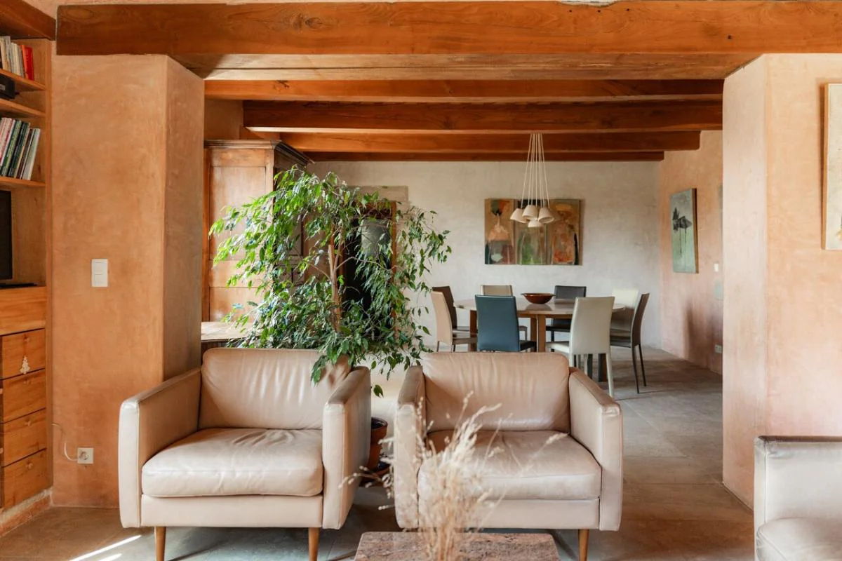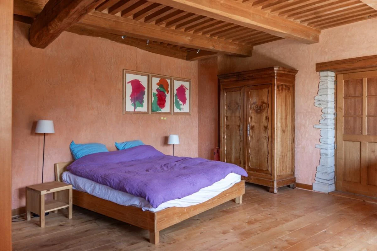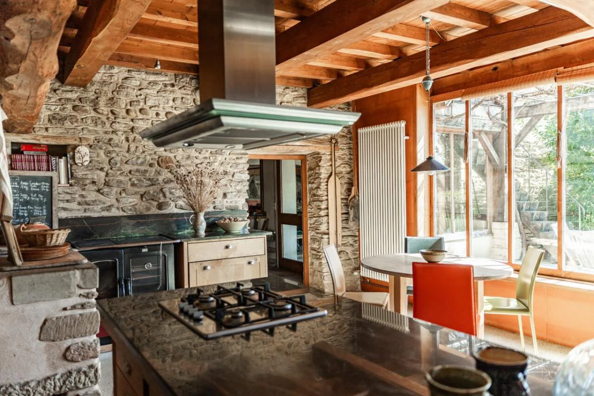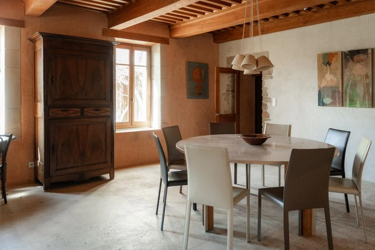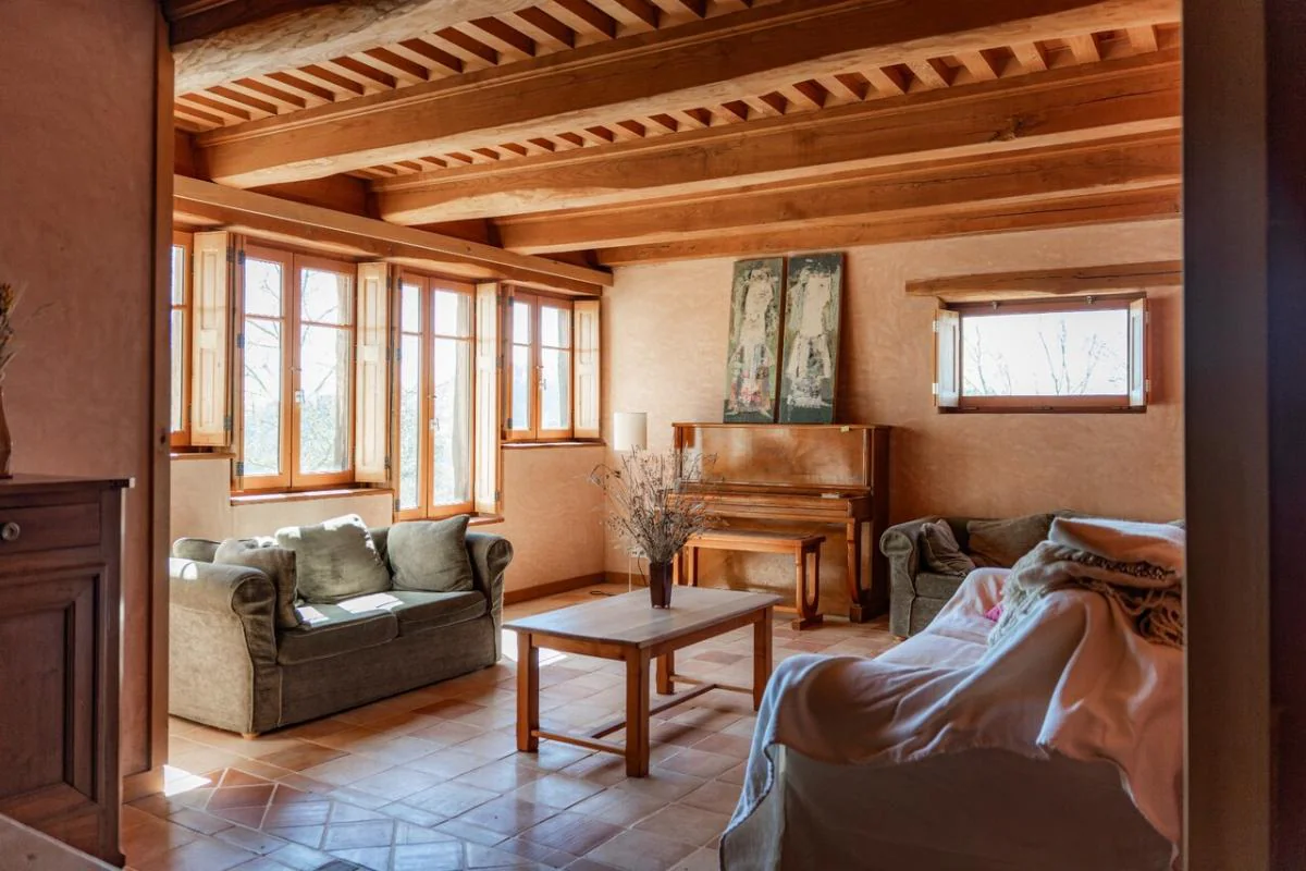 Les matériaux anciens - tomettes, parquet en essences variées, plafonds en châtaignier - offrent un cachet incomparable et un confort sain et durable.