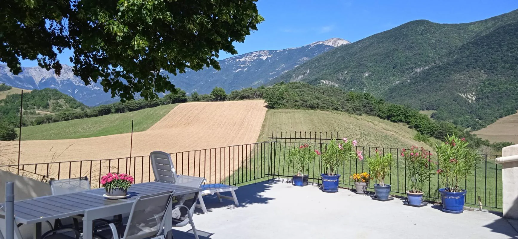 Une belle terrasse avec vue et jardin