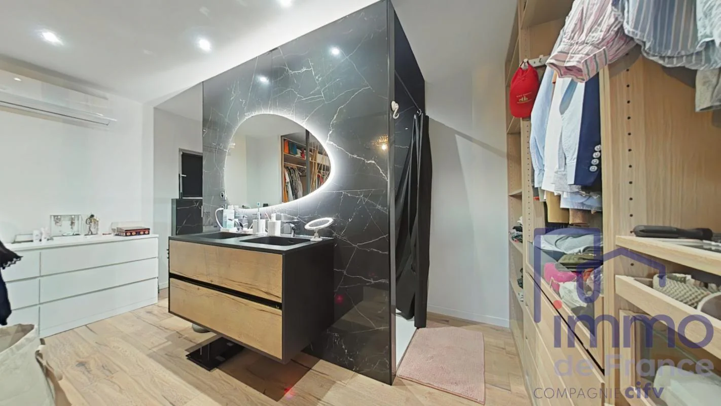 Dès l'entrée, vous serez séduit par le vaste séjour baigné de lumière, sublimé par un plafond cathédrale qui apporte volume et élégance à l'espace de vie grâce à ses belles ouvertures.