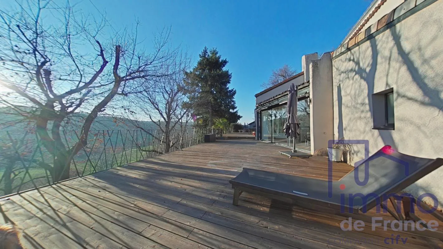 A l'extérieur, la propriété propose une superbe terrasse de 250m2 idéale pour recevoir, avec une vue imprenable sur la campagne environnante.