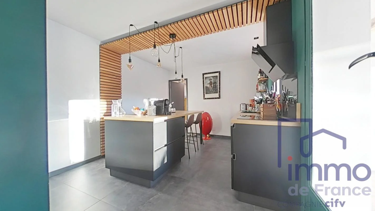La cuisine entièrement indépendante et équipée est fonctionnelle et conviviale, donnant accès sur un espace pour des repas chaleureux sous une terrasse couverte.