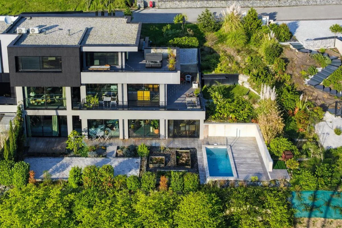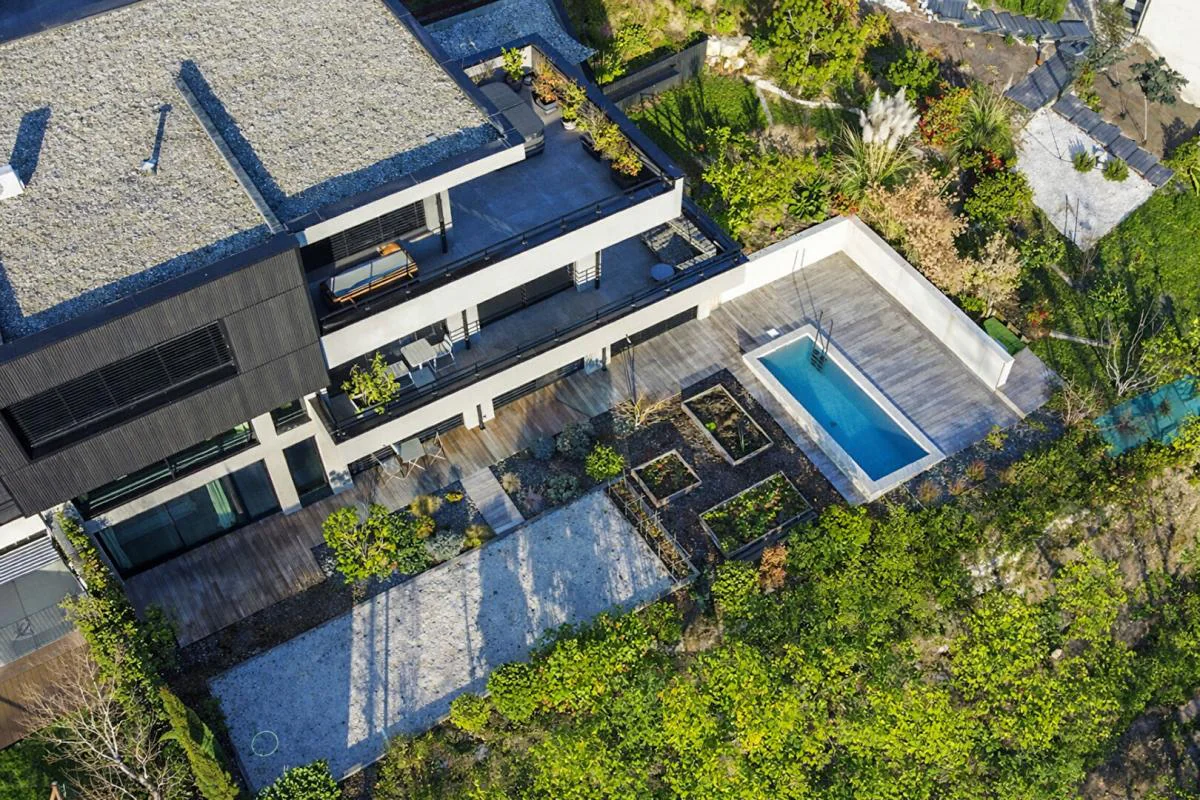 Ascenseur desservant chaque niveau, chauffage au sol par pompe à chaleur réversible, climatisation, carrelage grand format, brise-soleil orientables et équipements techniques de dernière génération témoignent d'un niveau d'exigence.