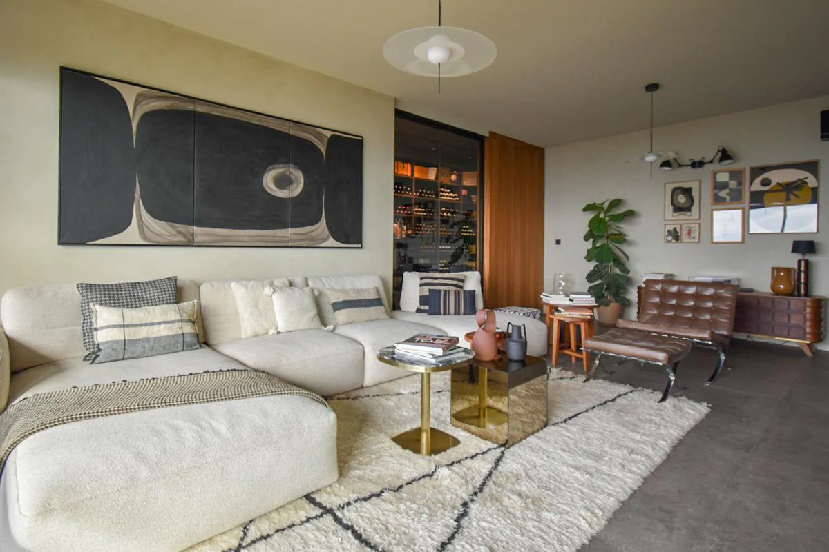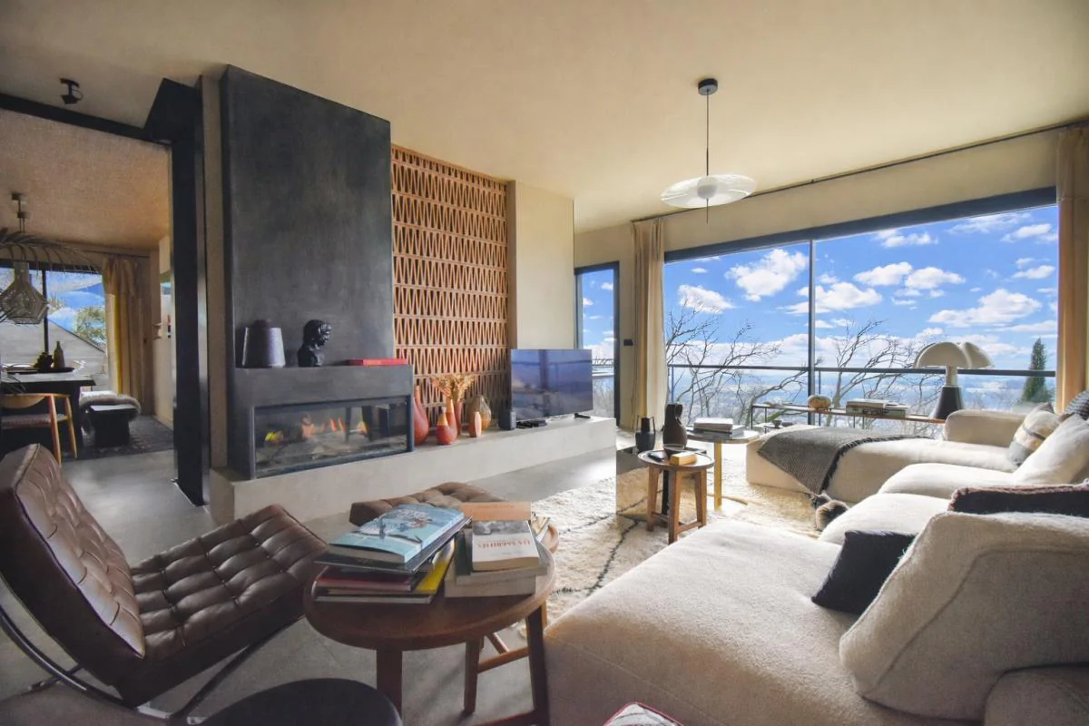 Le salon, habillé d'un mur en briques et réchauffé par une cheminée électrique, offre une atmosphère à la fois contemporaine et chaleureuse. Une cave à vin aménagée vient parfaire cet espace.