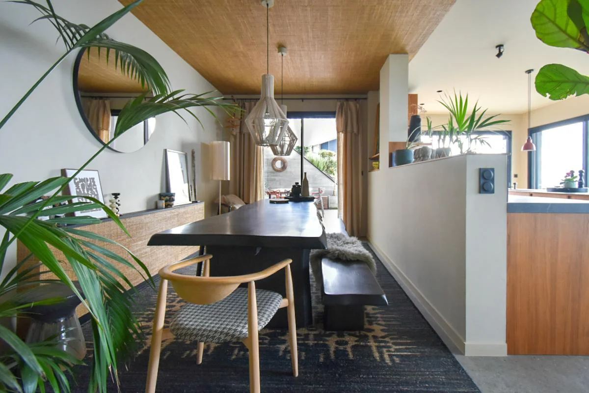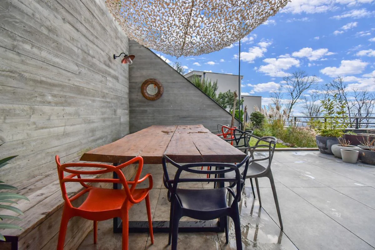 L'espace de vie principal, baigné de lumière, révèle une cuisine en noyer avec un plan de travail en céramique, ouverte sur une élégante salle à manger prolongée par une terrasse conviviale avec espace repas et barbecue.