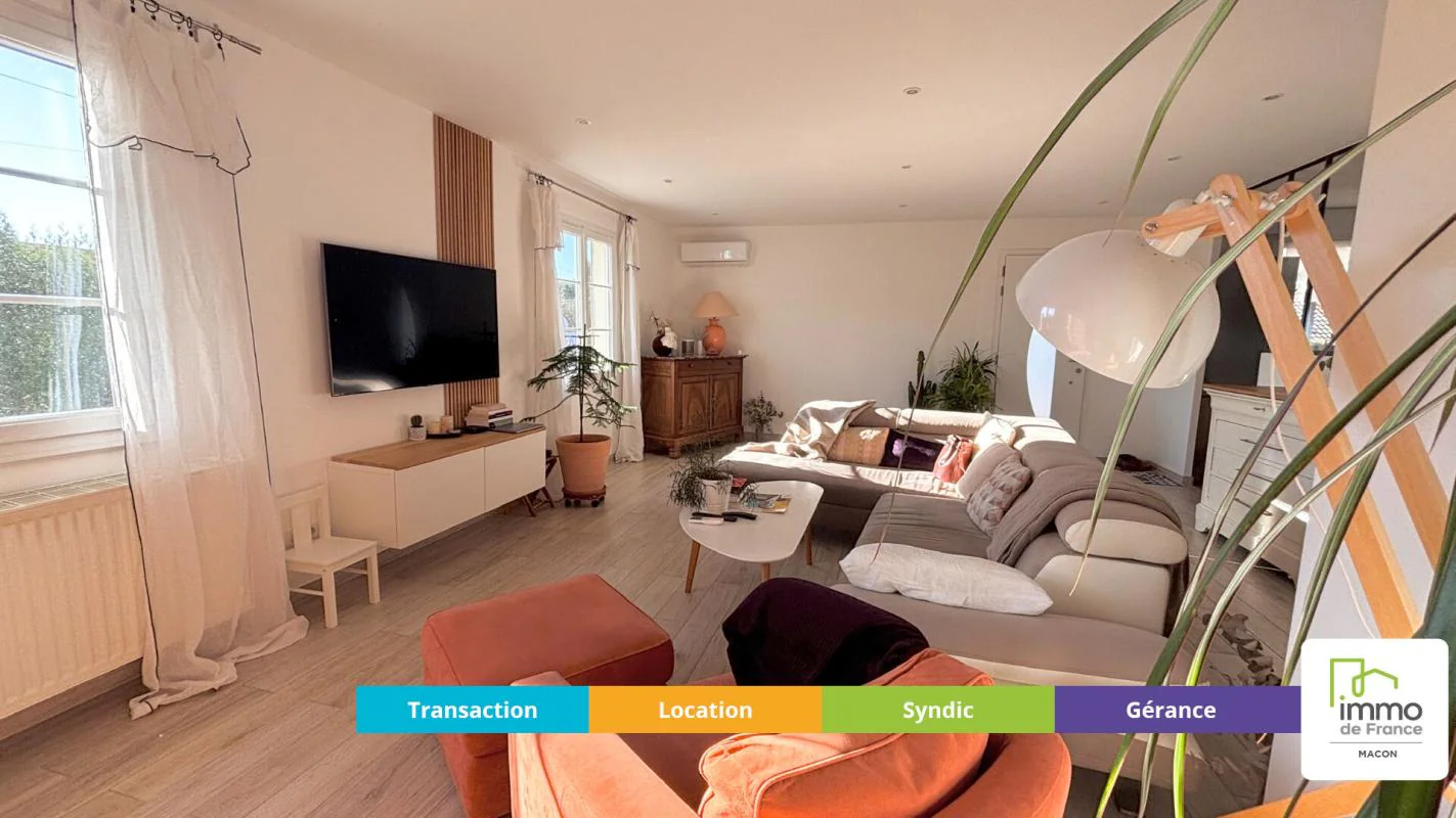 Le tout sur terrain clos et arboré de 1095m², au calme et à seulement 10 min de Mâcon et accès autoroute.