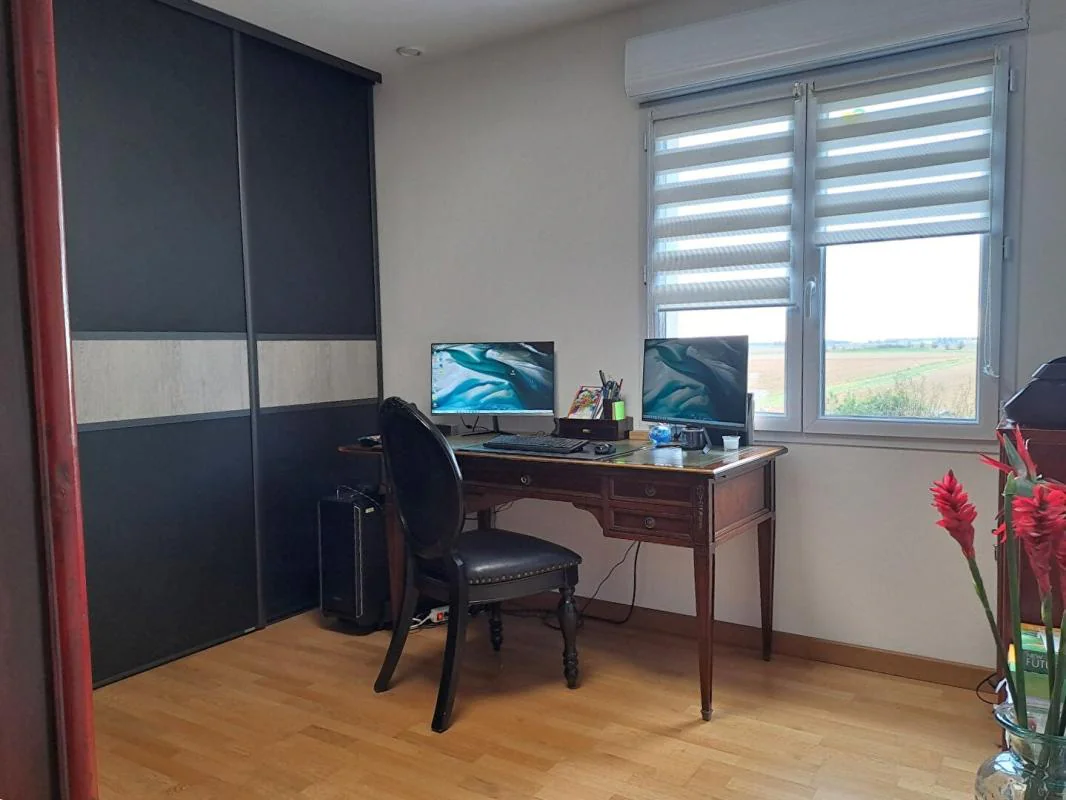 L'étage se compose d'une pièce palière, d'une salle de bains avec douche, un WC séparé et quatre chambres avec placards intégrés dont une sert de bureau.