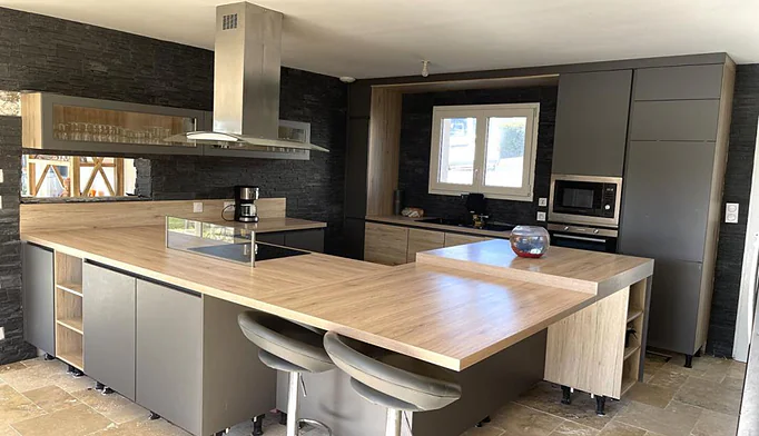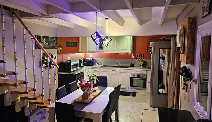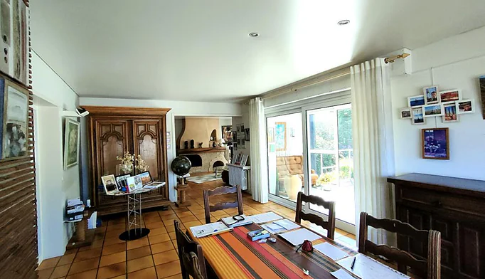 La pièce de vie, d'environ 80 m², bénéficie d'une exposition traversante, d'une belle hauteur sous plafond et d'une cuisine aménagée et entièrement équipée. La partie salon est agrémentée d'un poêle à granulés, apportant confort et chaleur.