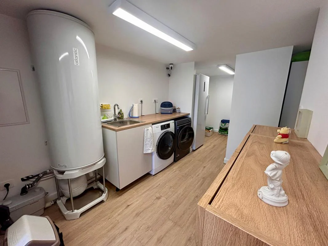 Le sous-sol entièrement aménagé constitue un véritable atout : vous y trouverez une buanderie, un bureau (parfait pour le télétravail ou une activité indépendante) ainsi qu'un espace de stockage, permettant une organisation optimale de votre intérieur.