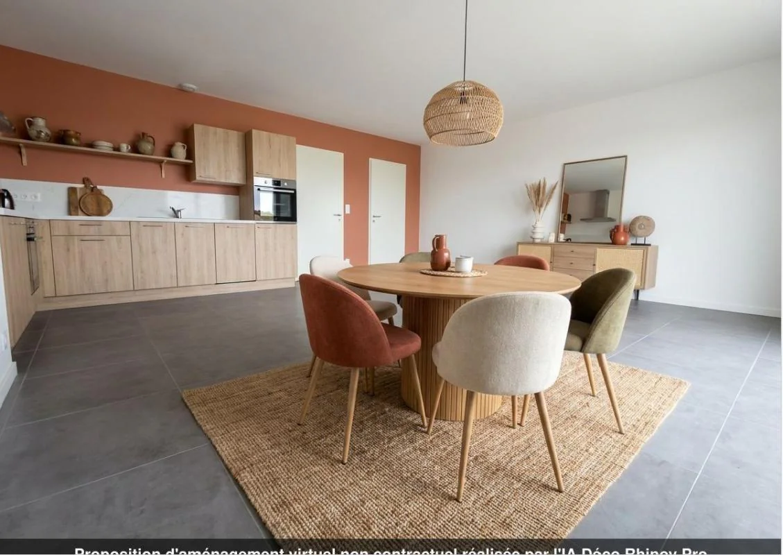 Superbe pièce de vie de près de 38 m2, baignée de lumière, avec cuisine intégrée contemporaine.