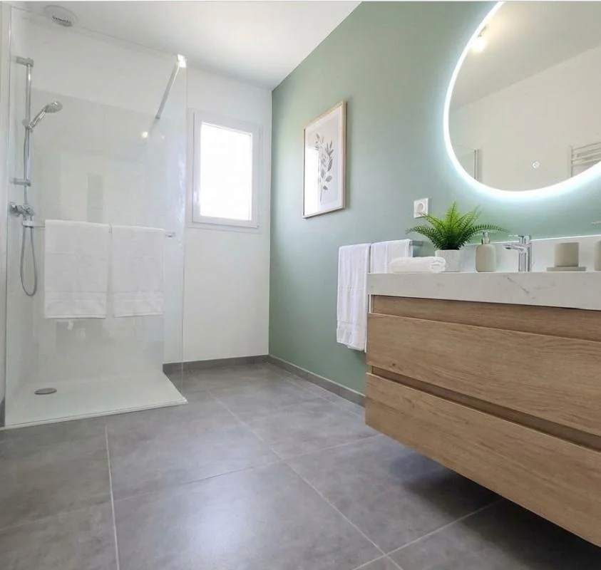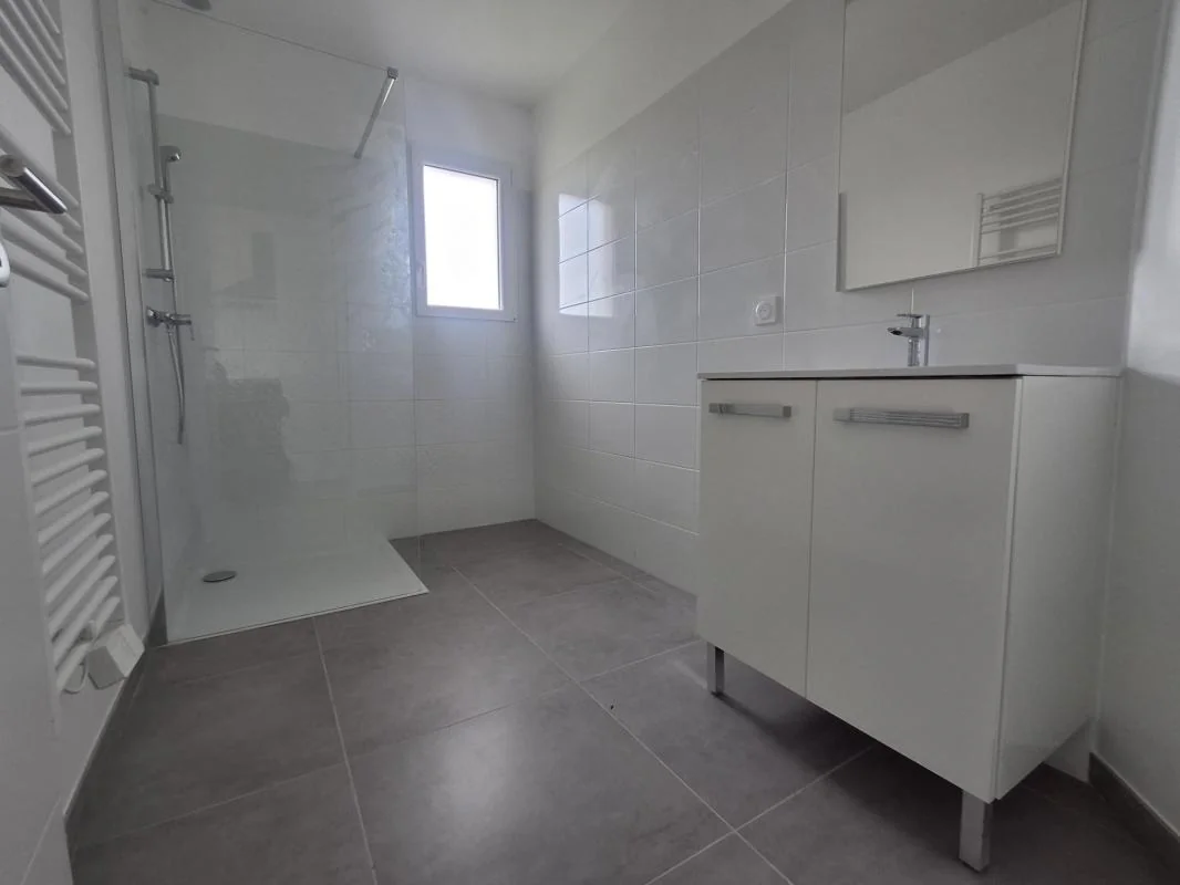 Salle d'eau élégante de 5,42 m2, équipée d'un bac de douche extra?plat et d'un sèche?serviette.