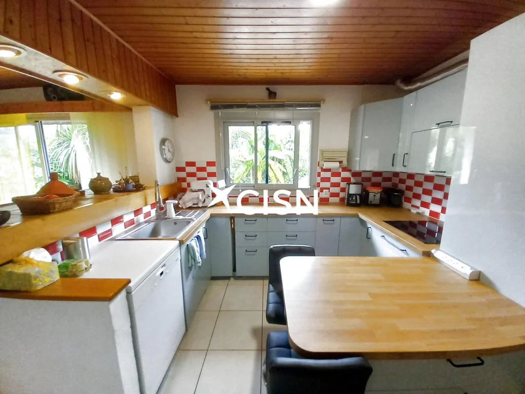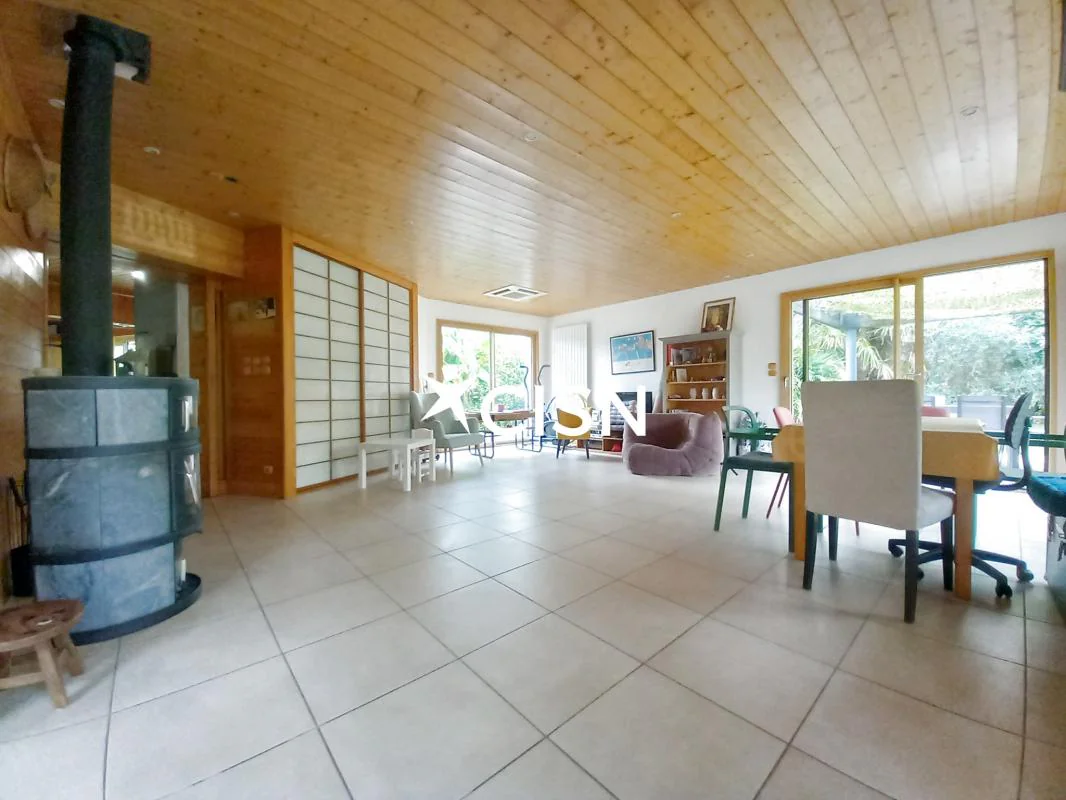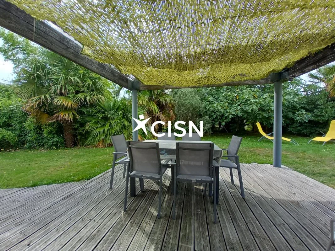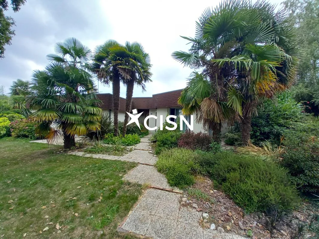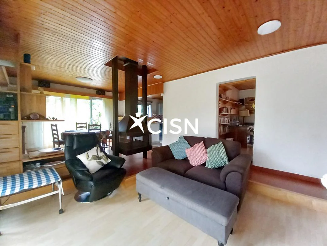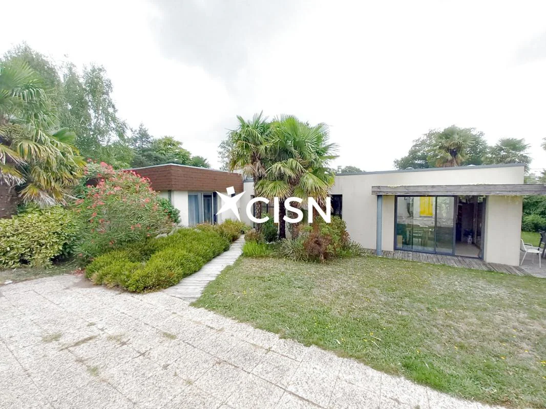 Cette maison d'architecte de 177 m2 entièrement de plain pied vous séduira pour son agencement intérieur atypique et un jardin clos, arboré, et sans vis à vis, proche du bourg. Au rez-de-chaussée, une entrée avec vestiaire, un séjour salle à manger avec cheminée centrale, une cuisine ouverte, une arrière cuisine, un bureau, une seconde vaste pièce de vie très lumineuse grace à ses nombreuses ouvertures et triple exposition, une buanderie, des toilettes, trois chambres et une salle d'eau. Egalement deux terrasses, un double garage, et des dépendances pour stocker... Coup de coeur pour le jardin de 1800 m2 et sa végétation !