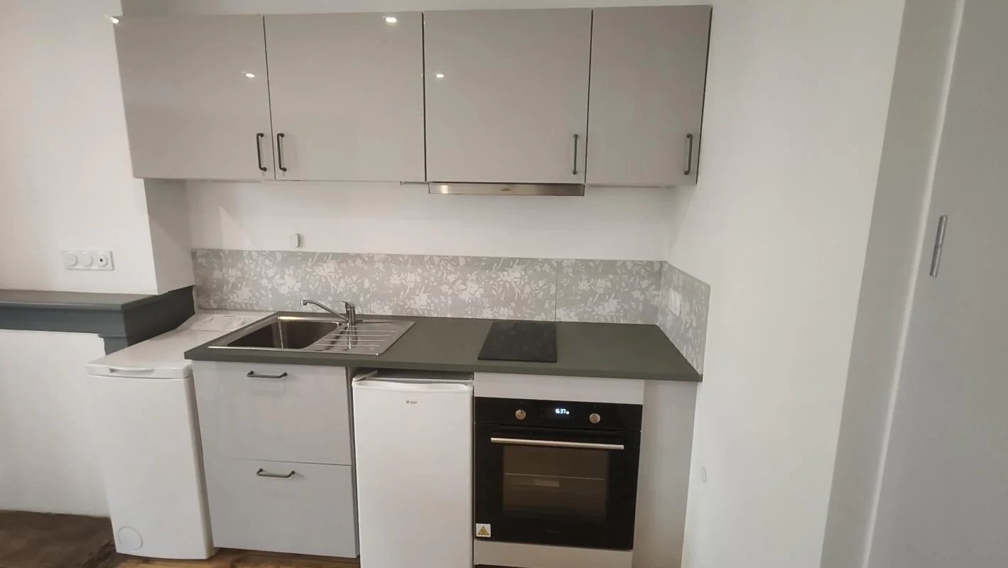 Studio entièrement rénové de 24.40 m² au 3ème étage sans ascenseur comprenant une pièce à vivre avec cuisine équipée (four- machine à laver- plaque de cuisson - frigo- table) - un coin salon/chambre et une salle de douches avec wc.