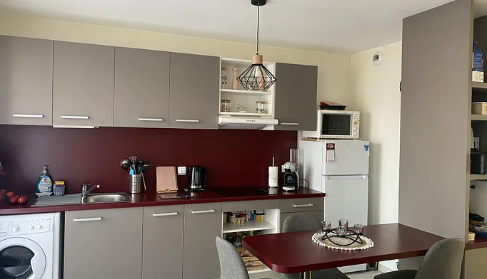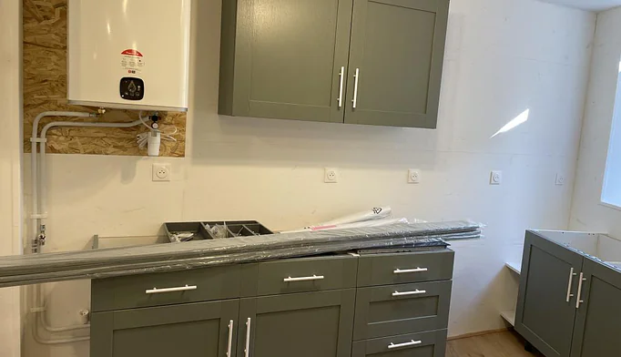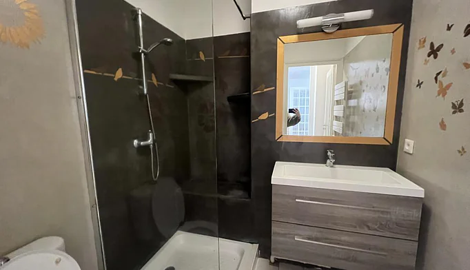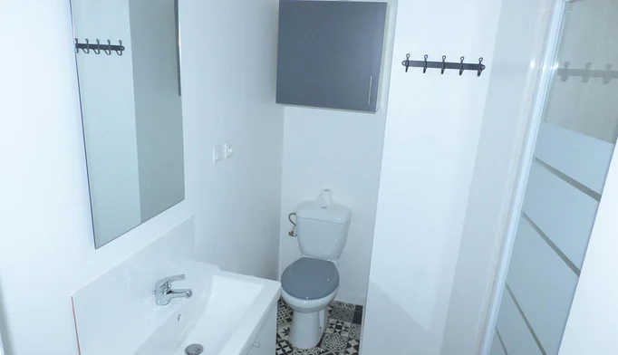 un dégagement, une salle d'eau moderne avec wc, une cuisine équipée neuve, et une pièce principale avec un coin chambre.