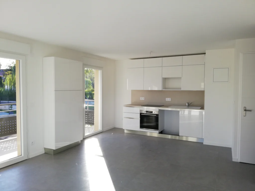 A LOUER A VALLEIRY, dans la résidence récente POSITIV, appartement meublé de type 3 au 1er étage comprenant une entrée avec placard, une pièce à vivre avec cuisine entièrement équipée ouverte sur séjour et un balcon de 12 m², deux chambres avec grand placards, salle de bains, WC séparés et cellier dans l'appartement.