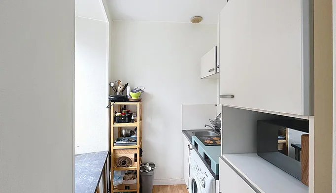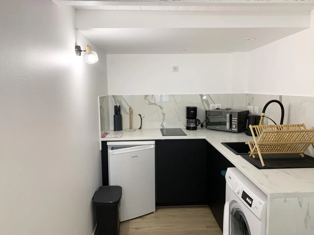 Au rez de chaussée, une cuisine toute équipée et aménagée (frigo top, machine à laver, micro-ondes). À l'étage, un petit coin séjour donnant accès à la chambre avec ses rangements. Une salle d'eau avec wc.