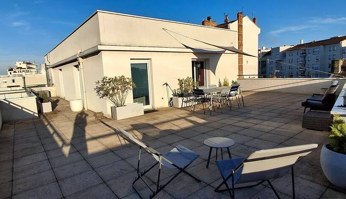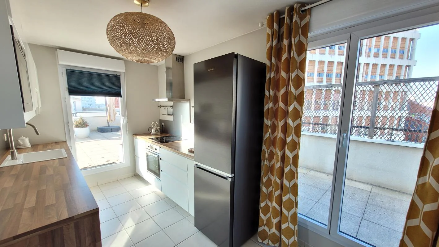 Secteur Part Dieu, avenue Félix Faure, appartement 2 pièces meublé de 51.57 m² au 7ème avec une terrasse de 99 m² parfaite pour profiter des beaux jours, recevoir, aménager un espace détente ou repas en extérieur, cuisine aménagée et équipée, séjour, une chambre avec salle de bains, WC séparés, chauffage individuel électrique, garage en sous sol, disponible de suite. Assurance multirisque (facultative) à partir de 23.14 € / mois - Zone soumise à encadrement des loyers : Loyer de base :1021.09 €. Loyer de référence majoré (loyer de base à ne pas dépasser) : 1021.09€. Complément de loyer: 262 € . Les informations sur les risques auxquels ce bien est exposé sont disponibles sur le Site Géorisques : www.georisques.gouv.fr