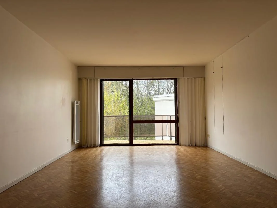 L'appartement s'ouvre sur une grande entrée avec placard menant à un séjour de plus de 25 m², lumineux, donnant accès à une terrasse agréable avec une vue exceptionnelle sur le parc.