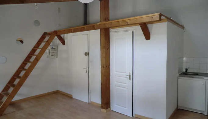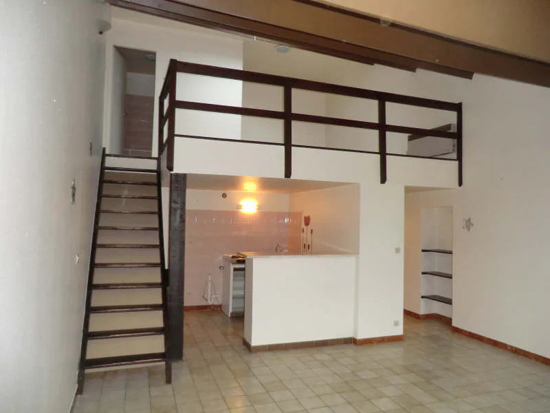 Appartement en duplex comprenant : une entrée avec placard, une kitchenette avec placard ouvert sur séjour, une chambre en mezzanine avec placard, une salle de bains avec WC. Chauffage individuel électrique. Jardin Collectif.