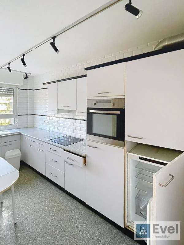 Appartement de type F4, situé au deuxième étage(sans ascenseur), comprenant une entrée avec débarras, une cuisine équipée (hotte, plaque de cuisson, four, lave-vaisselle, frigo), un salon, un séjour, deux chambres, une salle de bains et un WC.