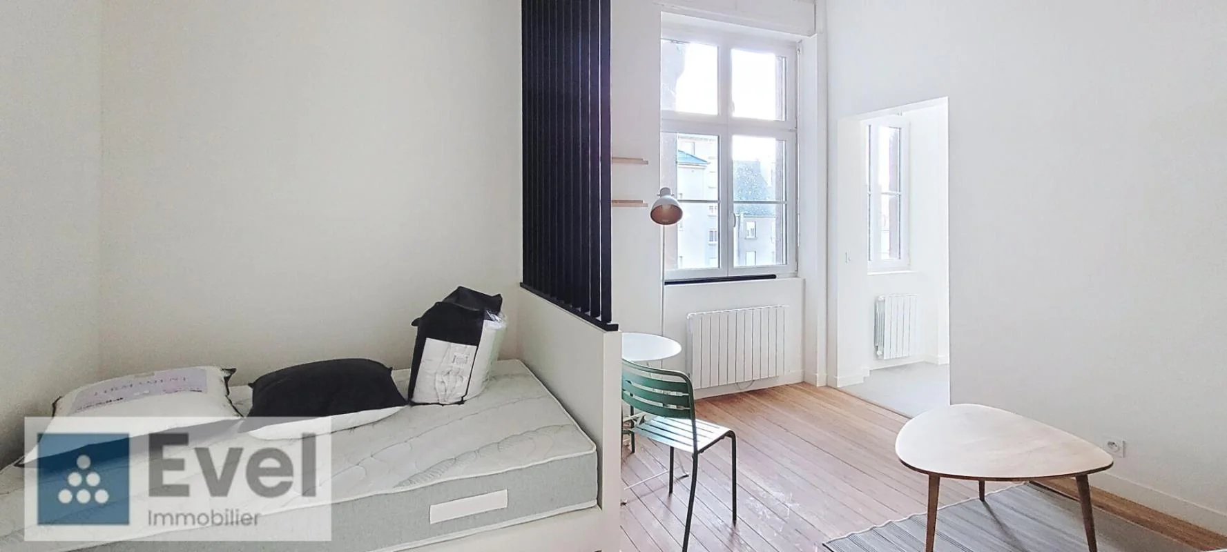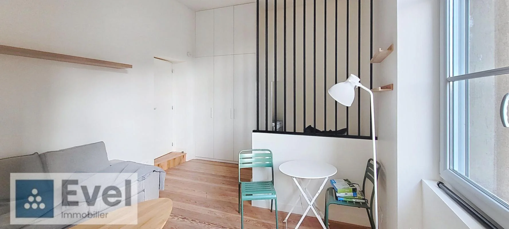 Beau studio meublé entièrement rénové, 25.92m² au 3ème étage avec ascenseur comprenant : cuisine aménagée (plaque de cuisson, réfrigérateur, micro-onde), pièce principale avec coin nuit séparé par claustra, salle de bains avec machine à laver, douche et WC.