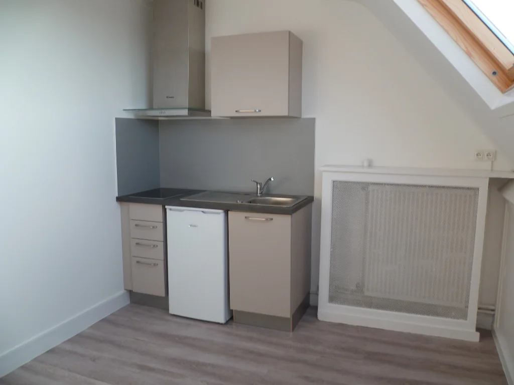 13 BIS RUE DE L'ARQUETTE A CAEN - CHAMBRE de 13.61m² située sous combles pièce principale avec espace cuisine aménagée et équipée, lavabo et douche, wc en commun sur le palier. Disponible le 04/05/2026.