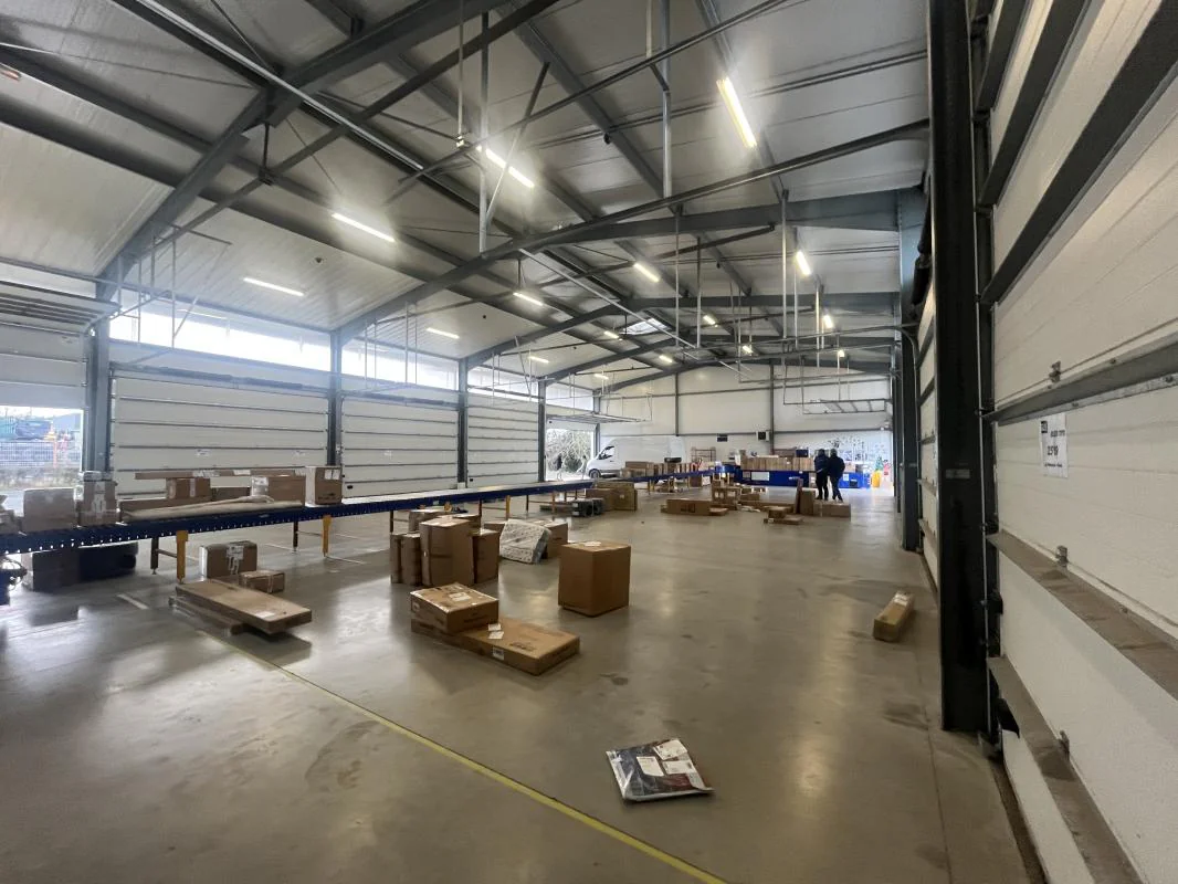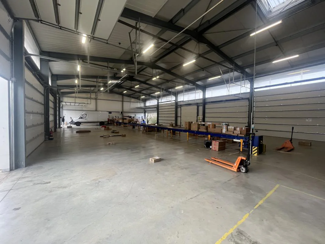 Description du bien : surface totale de 630m² avec partie bureaux et sanitaires de 80m² environ. Dépôt isolé (murs et plafonds), 10 portails en vis-à-vis, répartis de chaque côté du bâtiment (hauteurs variables allant de 3.60m à 4.80m), 2 portes d'accès latérales indépendantes, facilitant la circulation et les accès distincts.