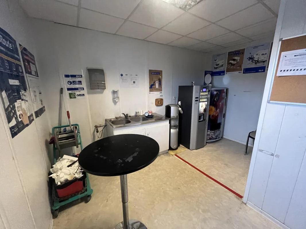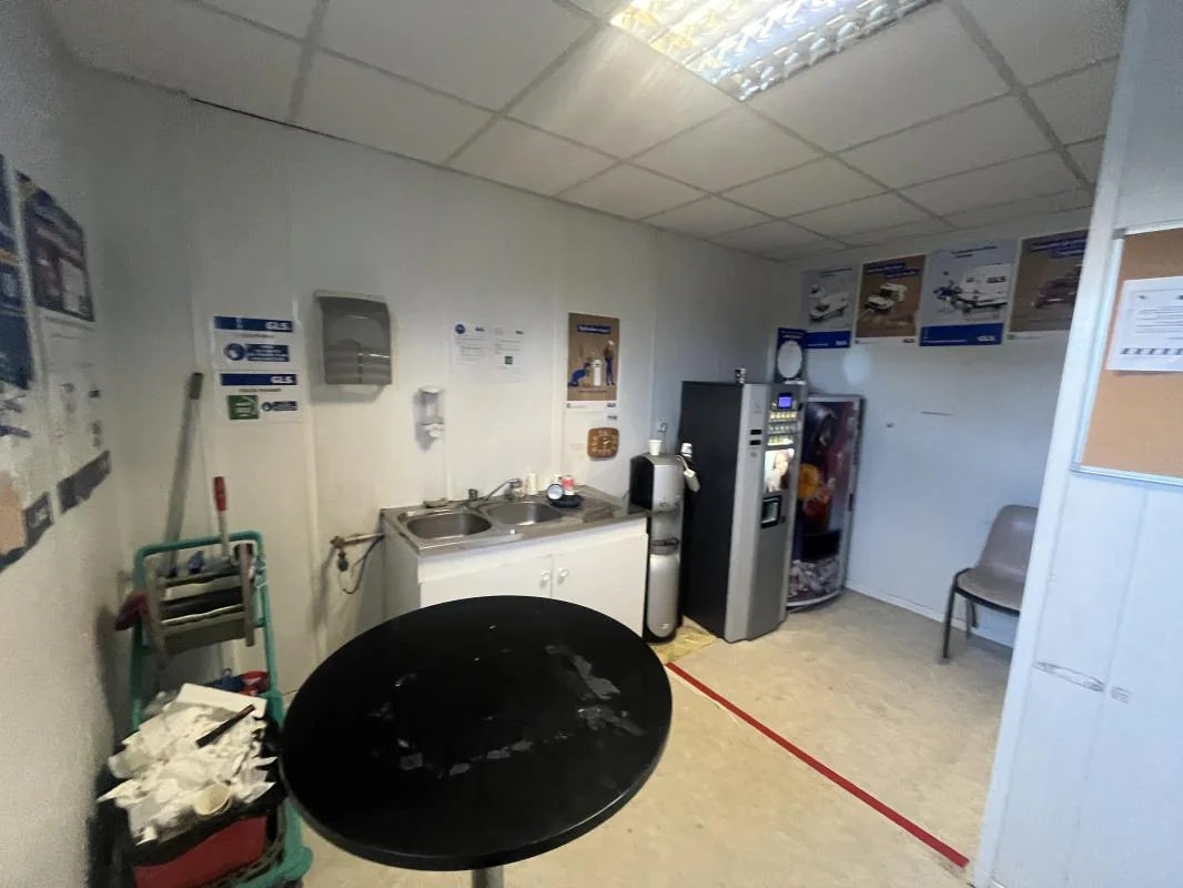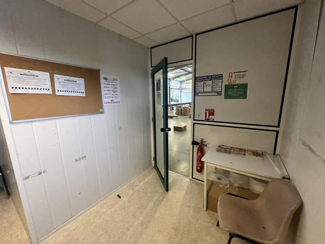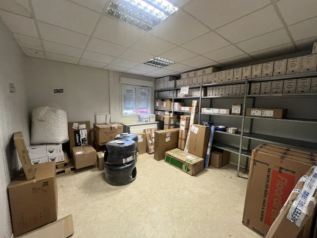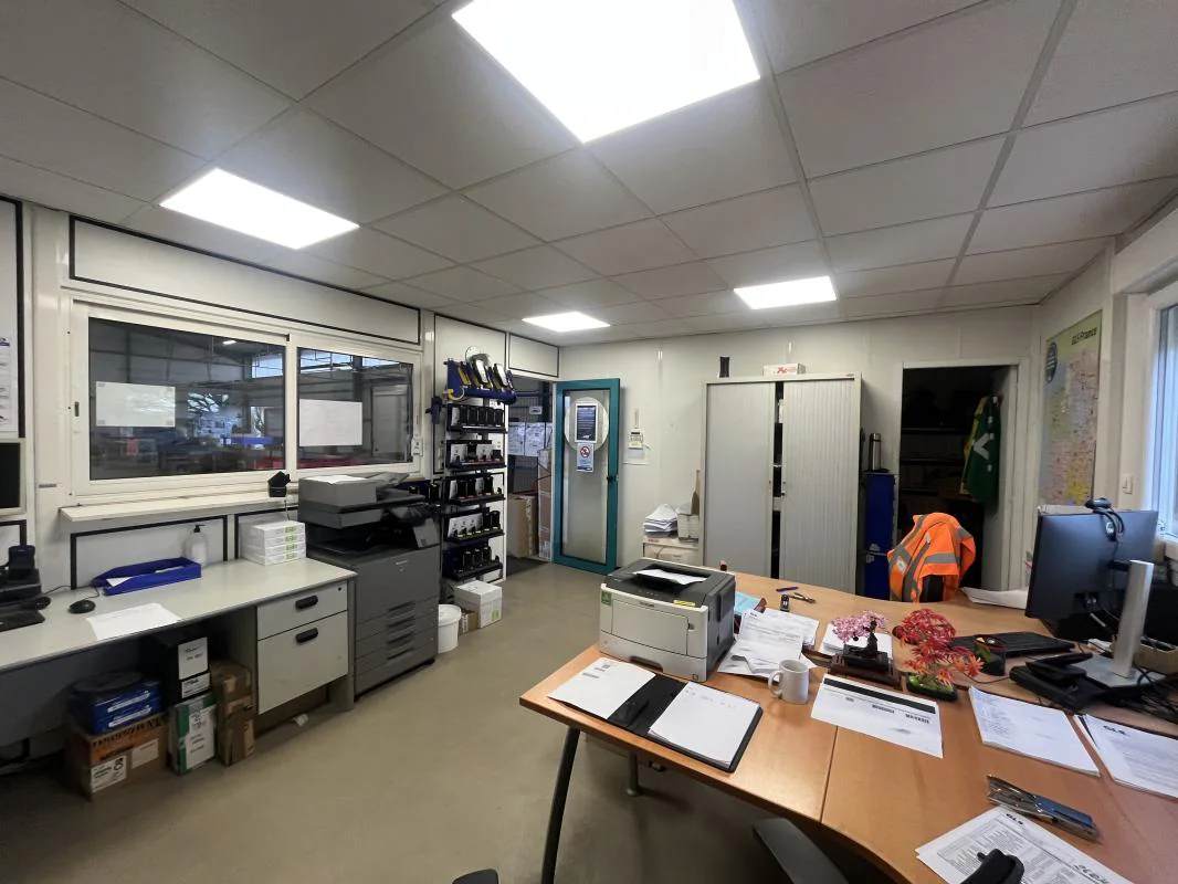 Partie bureau : le dépôt comprend également un local technique / réserve, un grand bureau double, un bureau en enfilade, séparé par une porte de liaison, un troisième bureau indépendant, deux sanitaires séparés (hommes/femmes), une salle de pause.
