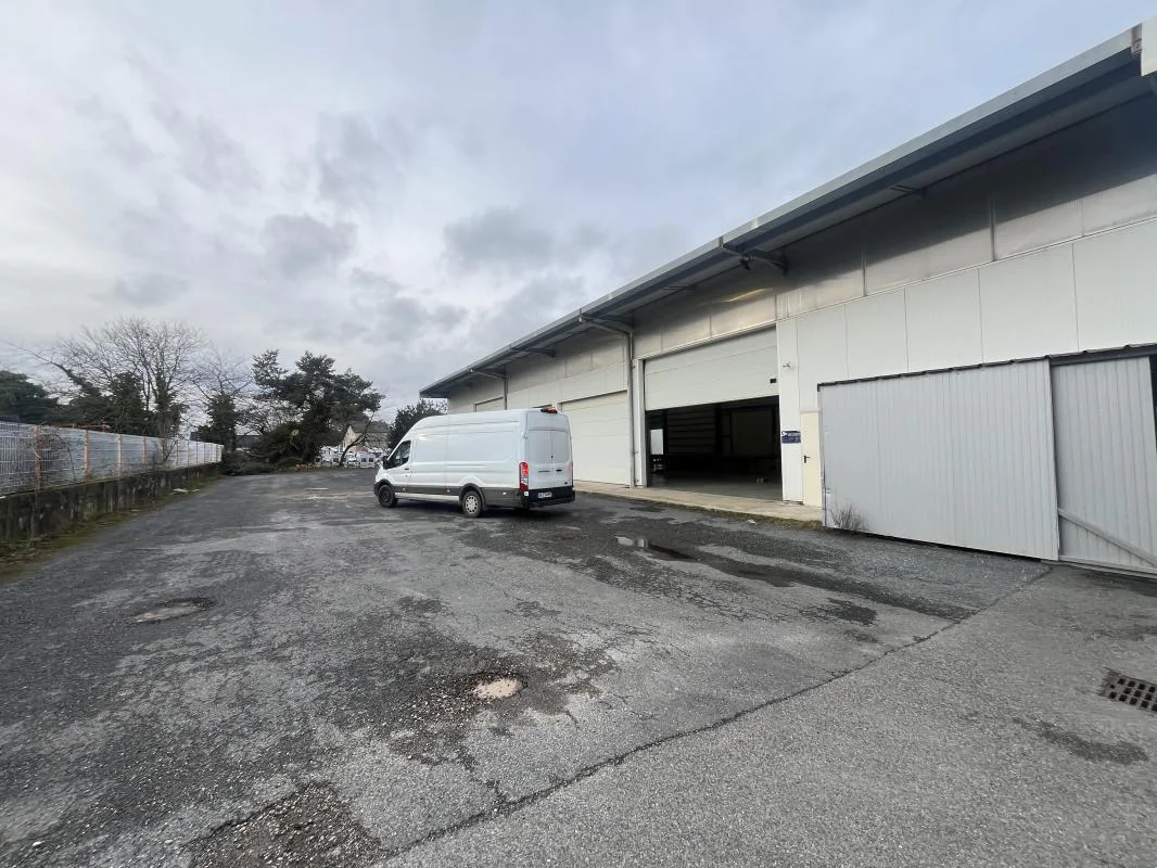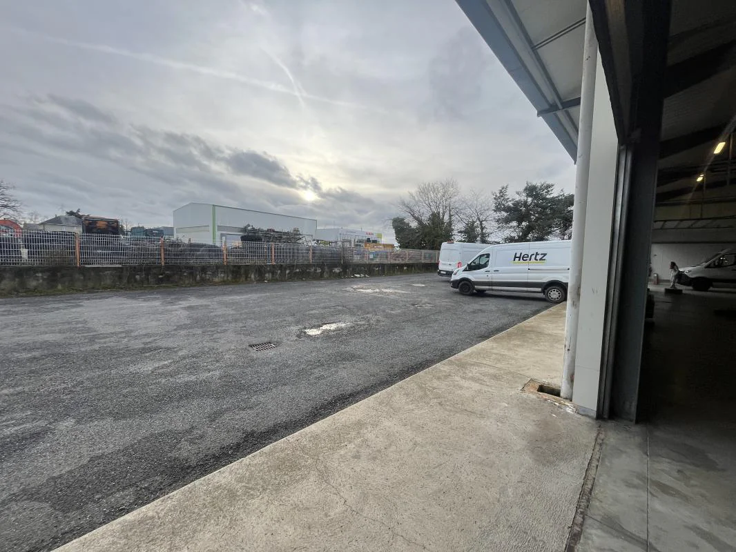 Vaste parking goudronné faisant le tour du bâtiment : idéal pour manœuvres, desserte des quais de déchargement et accès poids lourds.