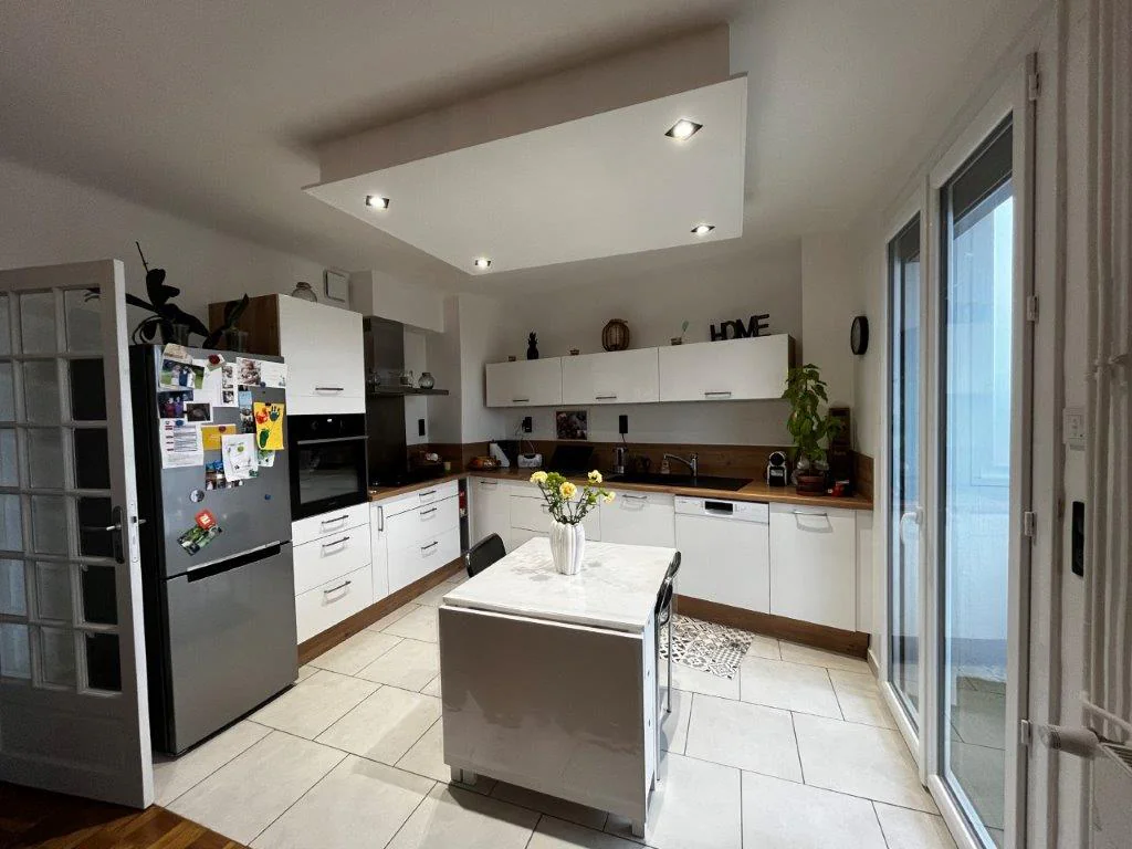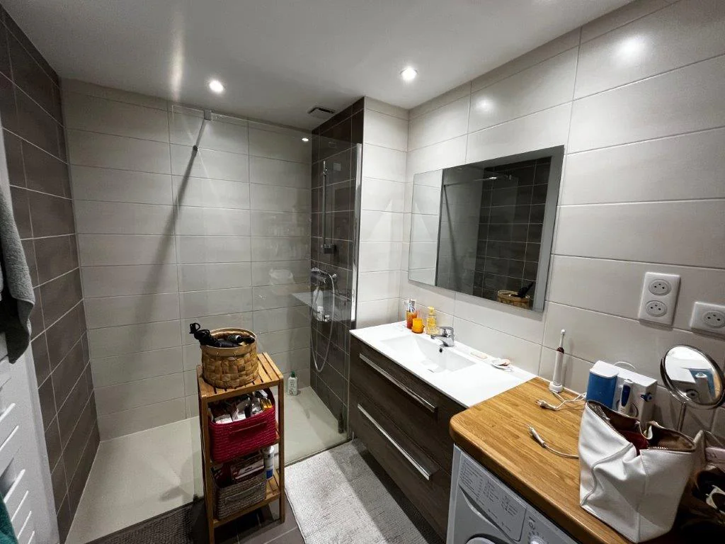 Une entrée avec placard, une cuisine américaine avec éléments haut et bas, une hotte, un four, plaque induction, lave-vaisselle, un séjour donnant sur balcon fermé, deux chambres avec placard dont une avec balcon, une salle d'eau avec meuble vasque, sèche serviette, cabine douche, un WC indépendant. Cave n°1 au -1. Chauffage collectif gaz.
