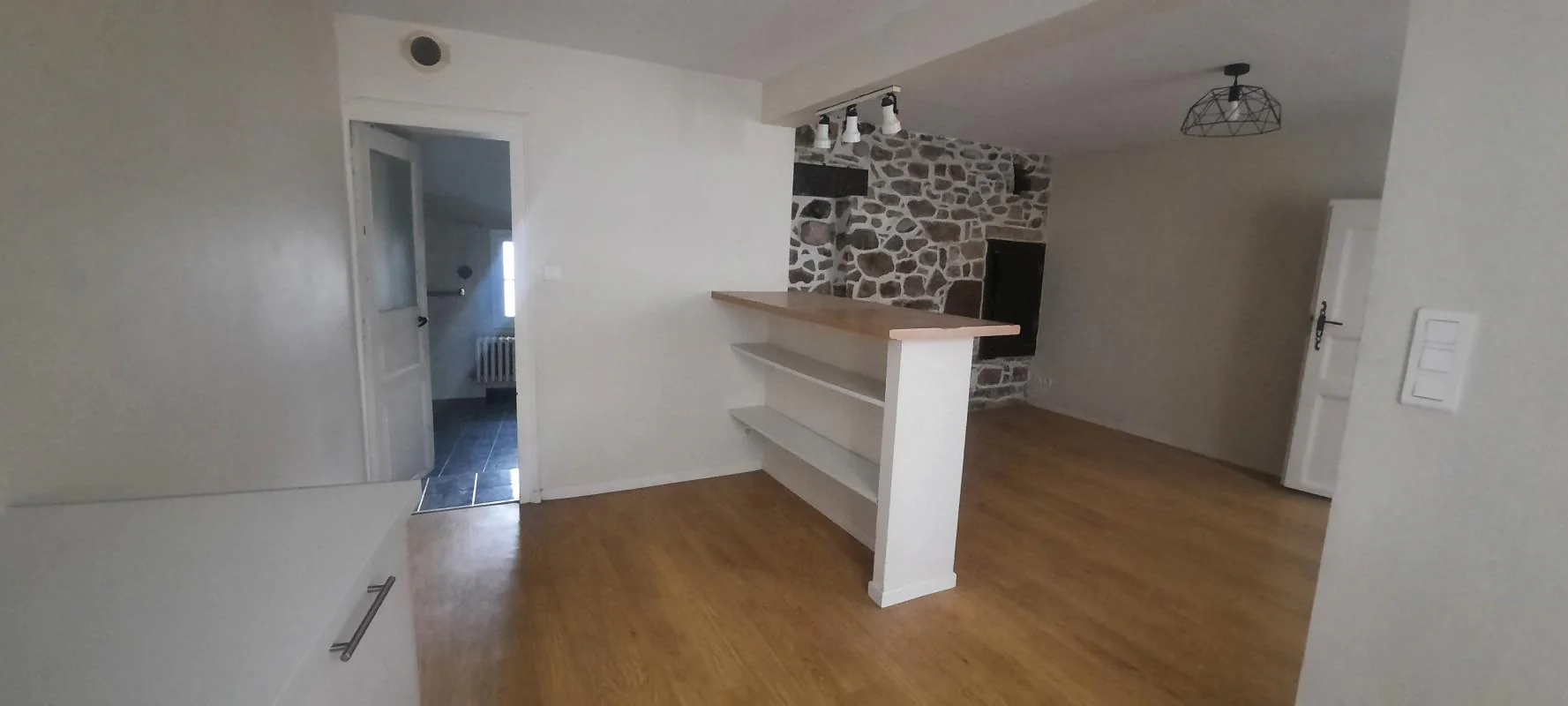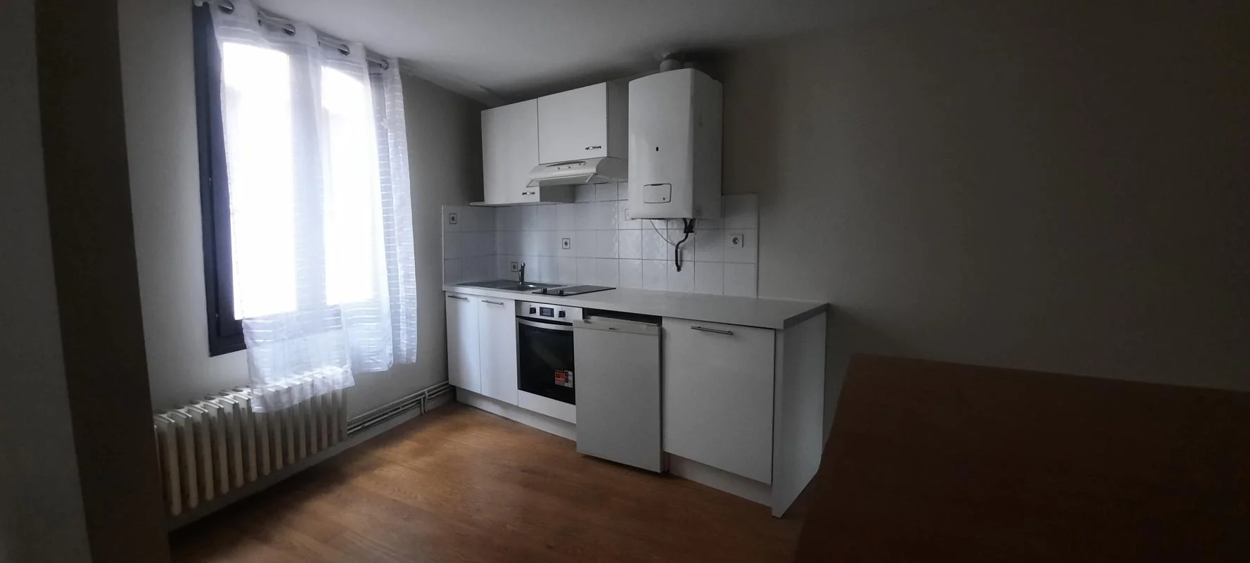 Pièce principale, cuisine équipée avec meubles, hotte, plaque, four et frigo. Une chambre, une salle d'eau, WC. Chauffage individuel gaz.