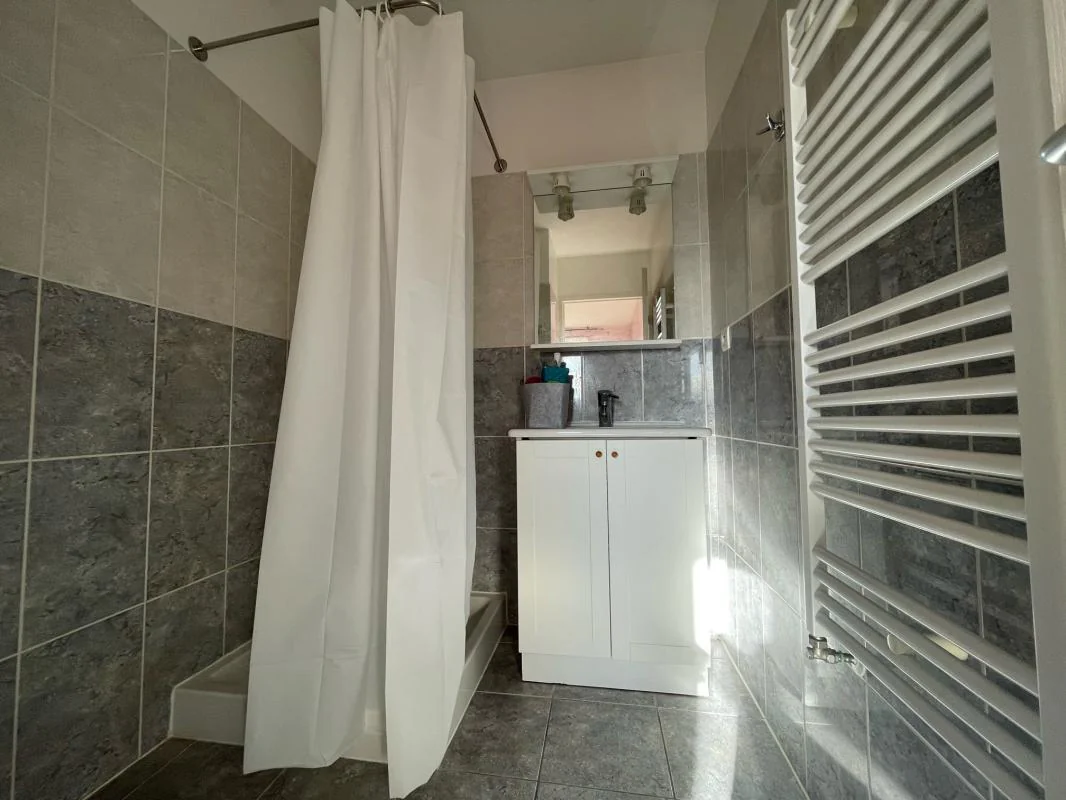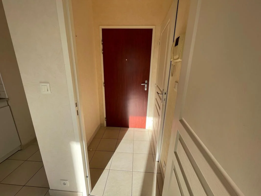 Sas d' entrée, WC indépendant, séjour avec coin kitchenette (2 feux gaz frigo) séparé par un bar, chambre avec placard, salle d'eau (meuble vasque), terrasse (15.84 m²) devant séjour. Chauffage collectif gaz personnalisé, ascenseur, interphone. Garage n°139 au niveau -2 (prise électrique.)
