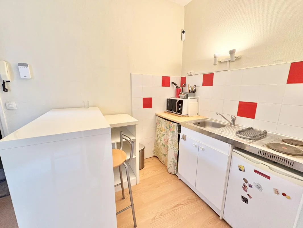 Le logement se compose d'une pièce principale lumineuse aménagée avec un espace nuit et des rangements. La cuisine est entièrement équipée avec plaques de cuisson, réfrigérateur, micro-ondes et vaisselle. La salle d'eau comprend une douche et des toilettes. L'appartement dispose du double vitrage et d'un chauffage inclus dans les charges. La résidence est sécurisée et bien entretenue.