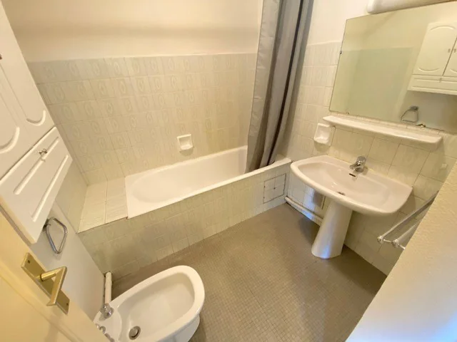 Il comprend : une entrée avec placard, une cuisine séparée, aménagée, équipée avec des rangements, un salon avec une grande porte fenêtre, une chambre, une salle de Bain avec un bidet et des toilettes séparés. Un garage et une cave sont inclus avec ce logement. Le chauffage est individuel au Gaz.