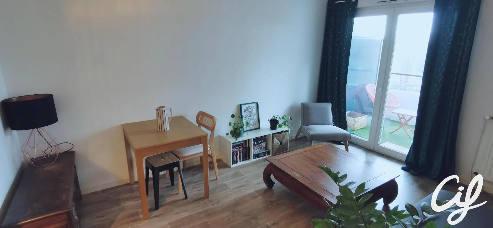 Il se compose d'une entrée avec placard ouverte sur le séjour avec coin cuisine aménagée et balcon, un dégagement dessert une chambre avec un rangement, et une grande salle d'eau.