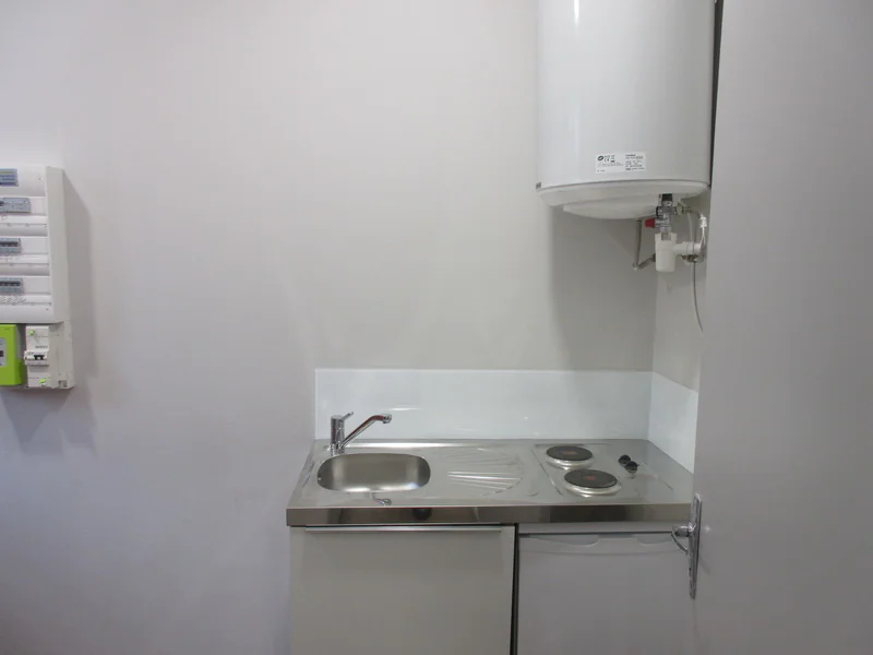 1 pièce technique d'environ 6.50m² avec kitchenette, frigo et table.